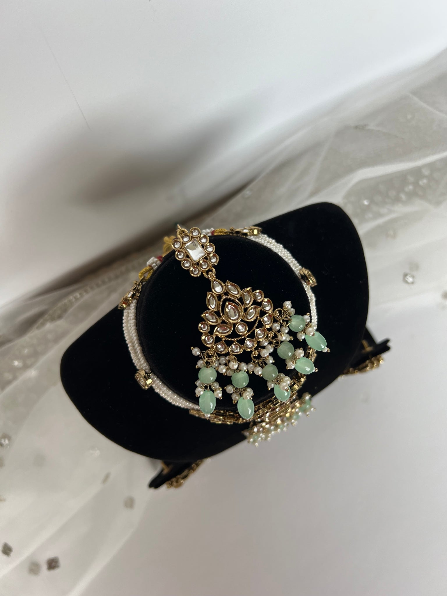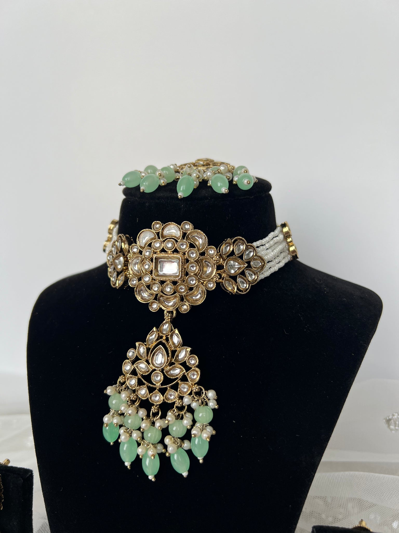 Stunning sage green choker set in kundan with a locket drop, comes with beautiful earrings and tikka