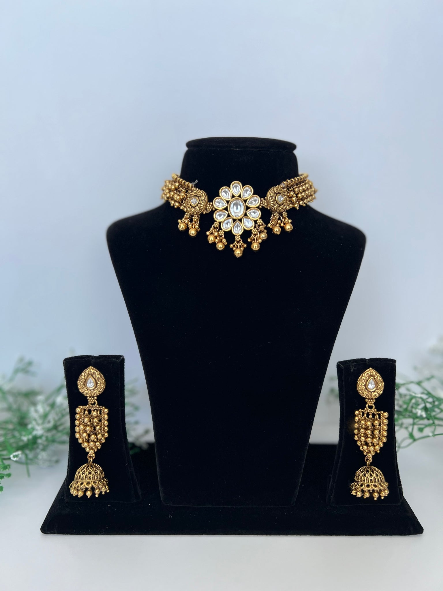 Stunning antique gold 22K gold plated set with jhumki earrings and kundan work