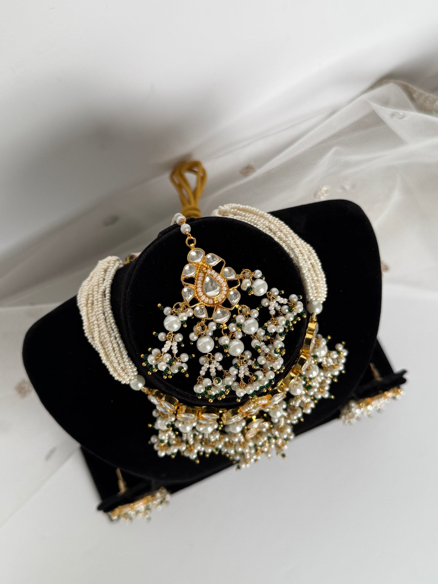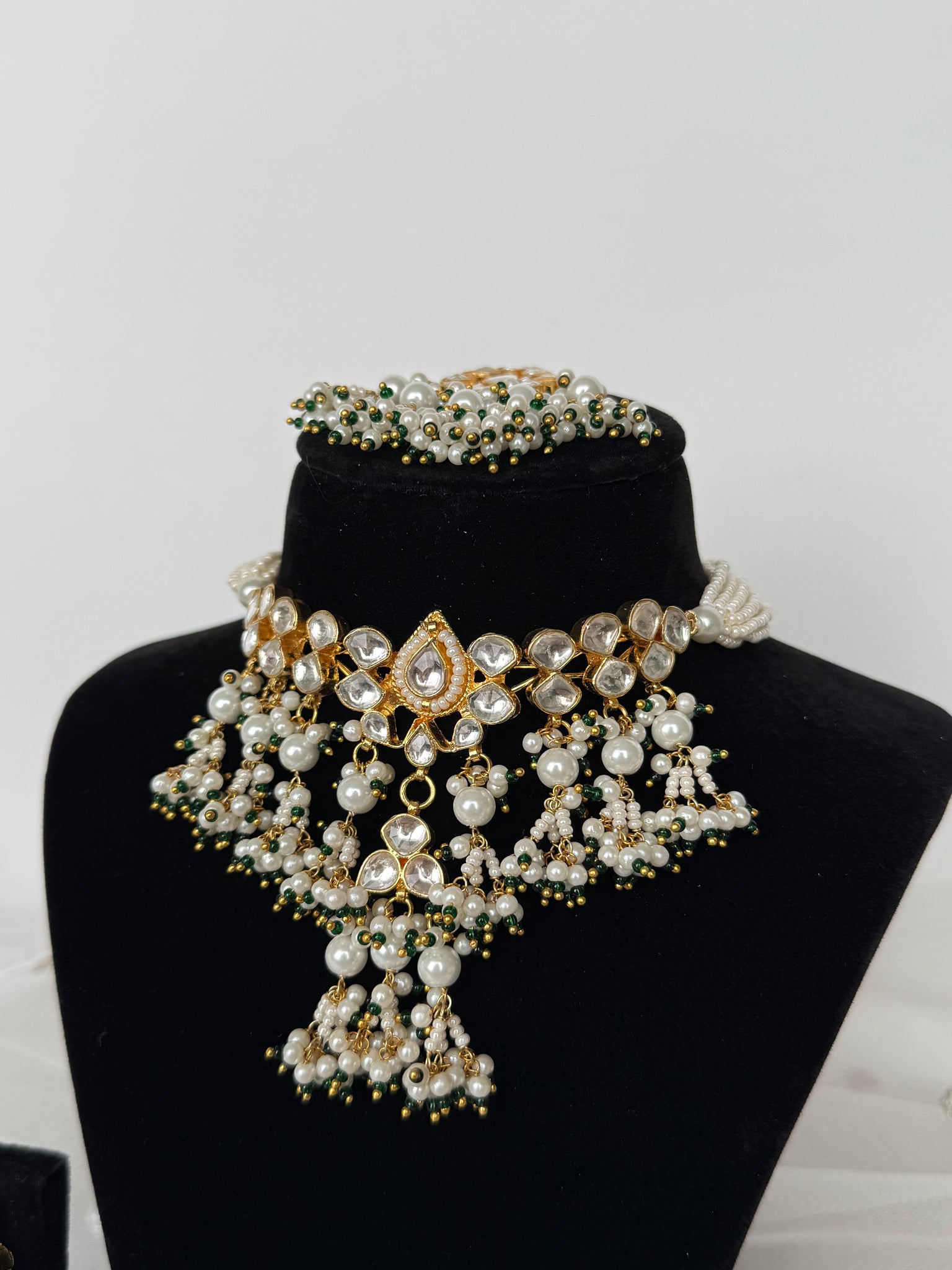 22K gold plated Pachi kundan ch knee set with white and accented green pearls, comes with earrings