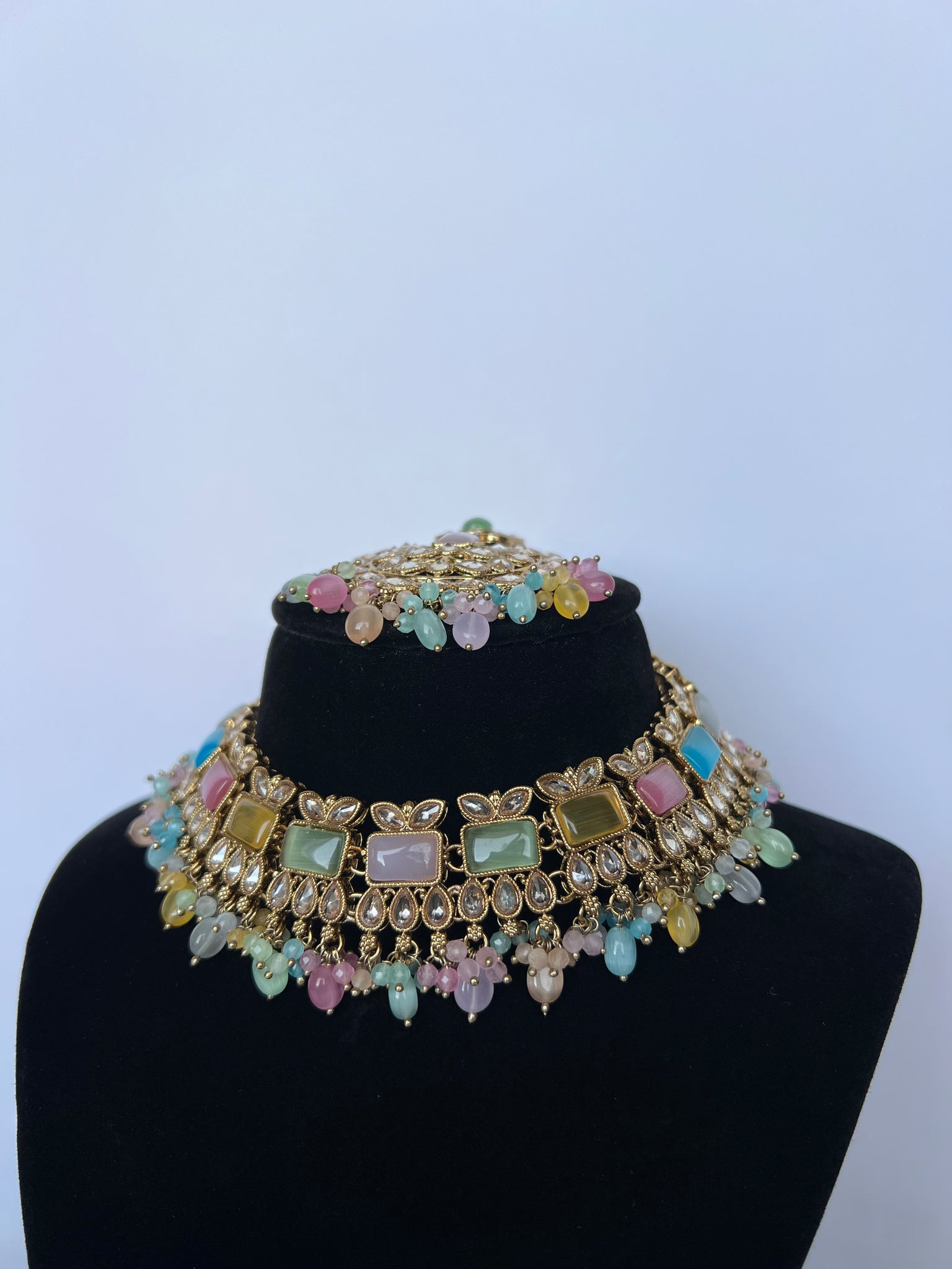 A beautiful multi necklace set with earrings tikka