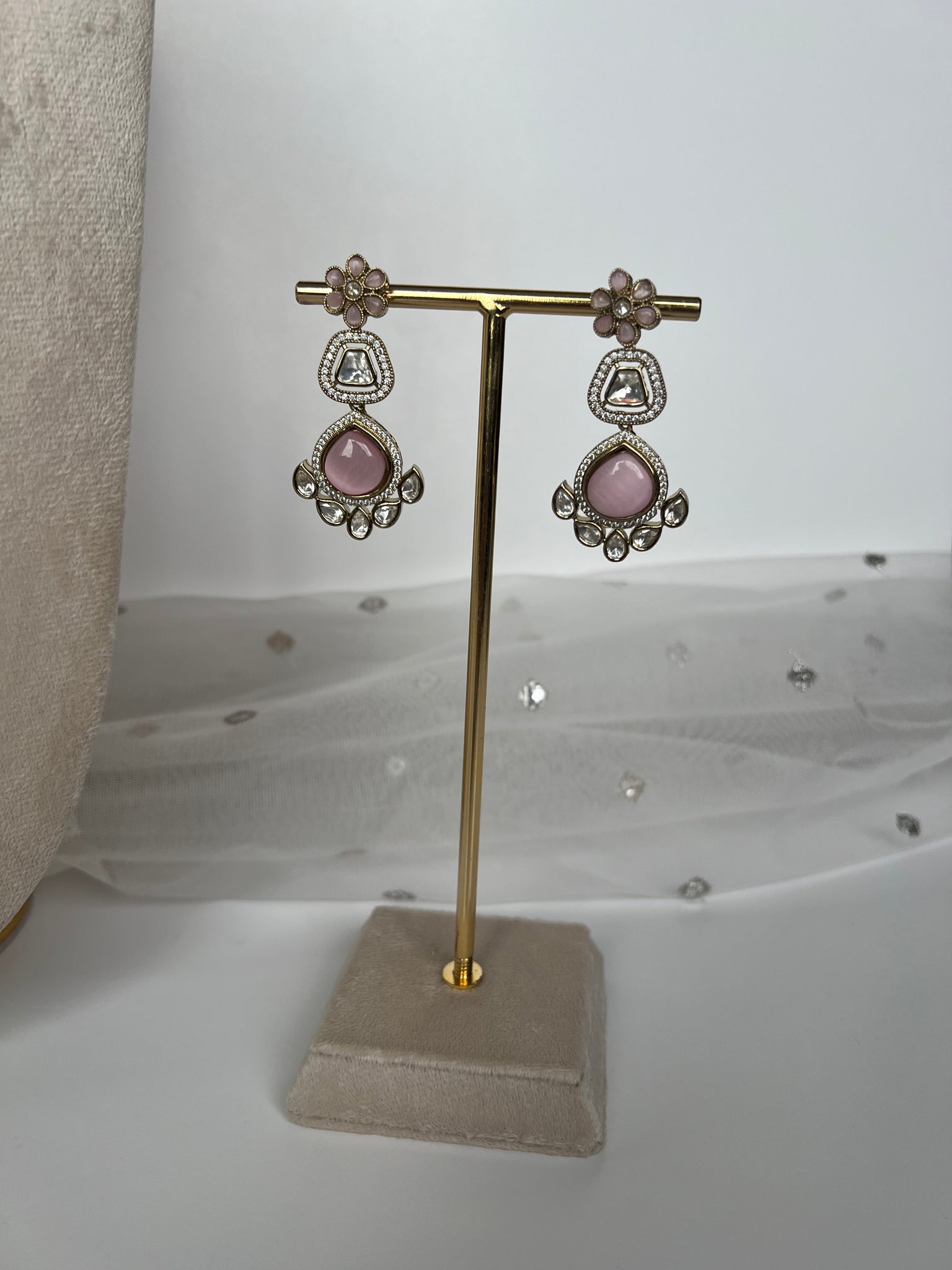 Stunning uncut kundan set in baby pink and gold with a pendant drop, comes with earrings
