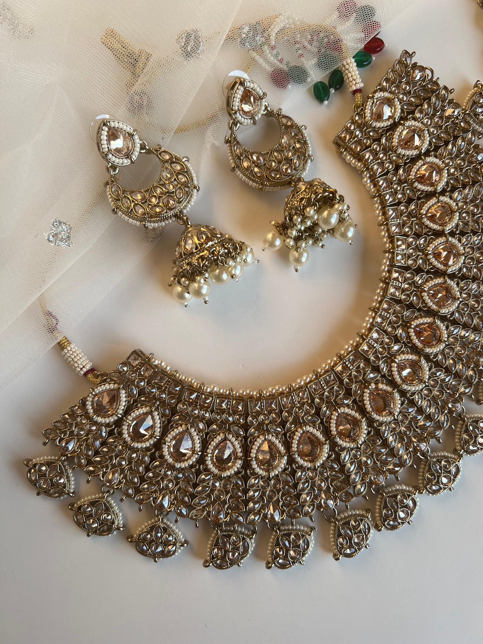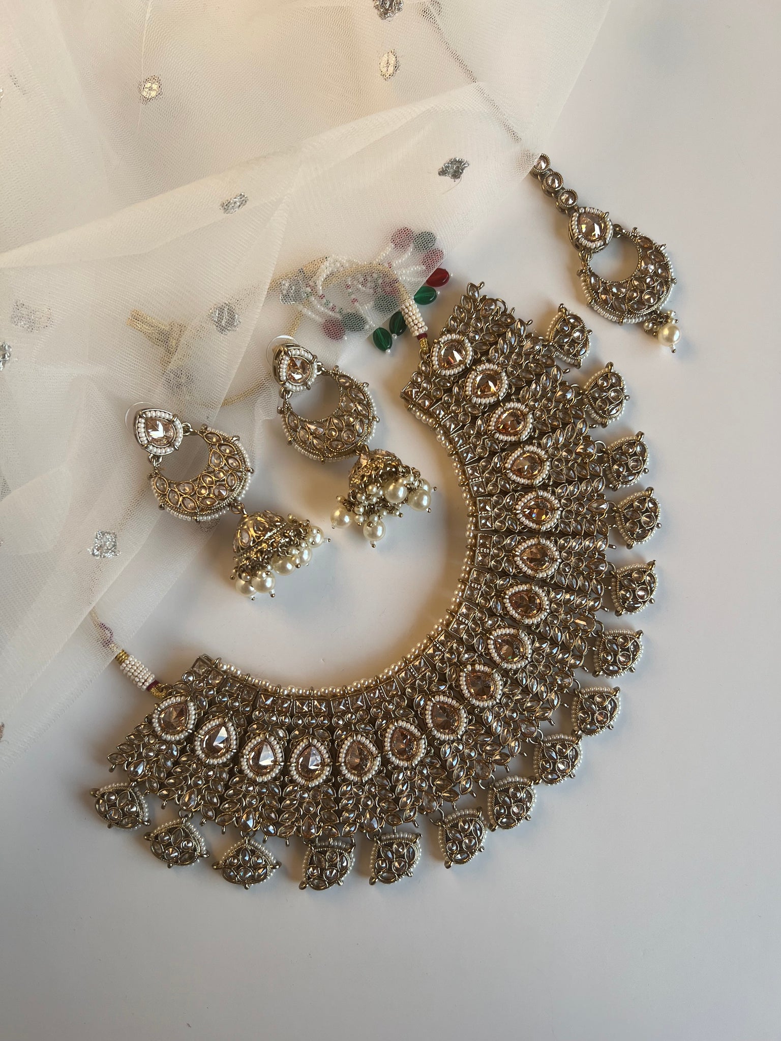 Beautiful golden bridal set with necklace jhumki earrings and tikka