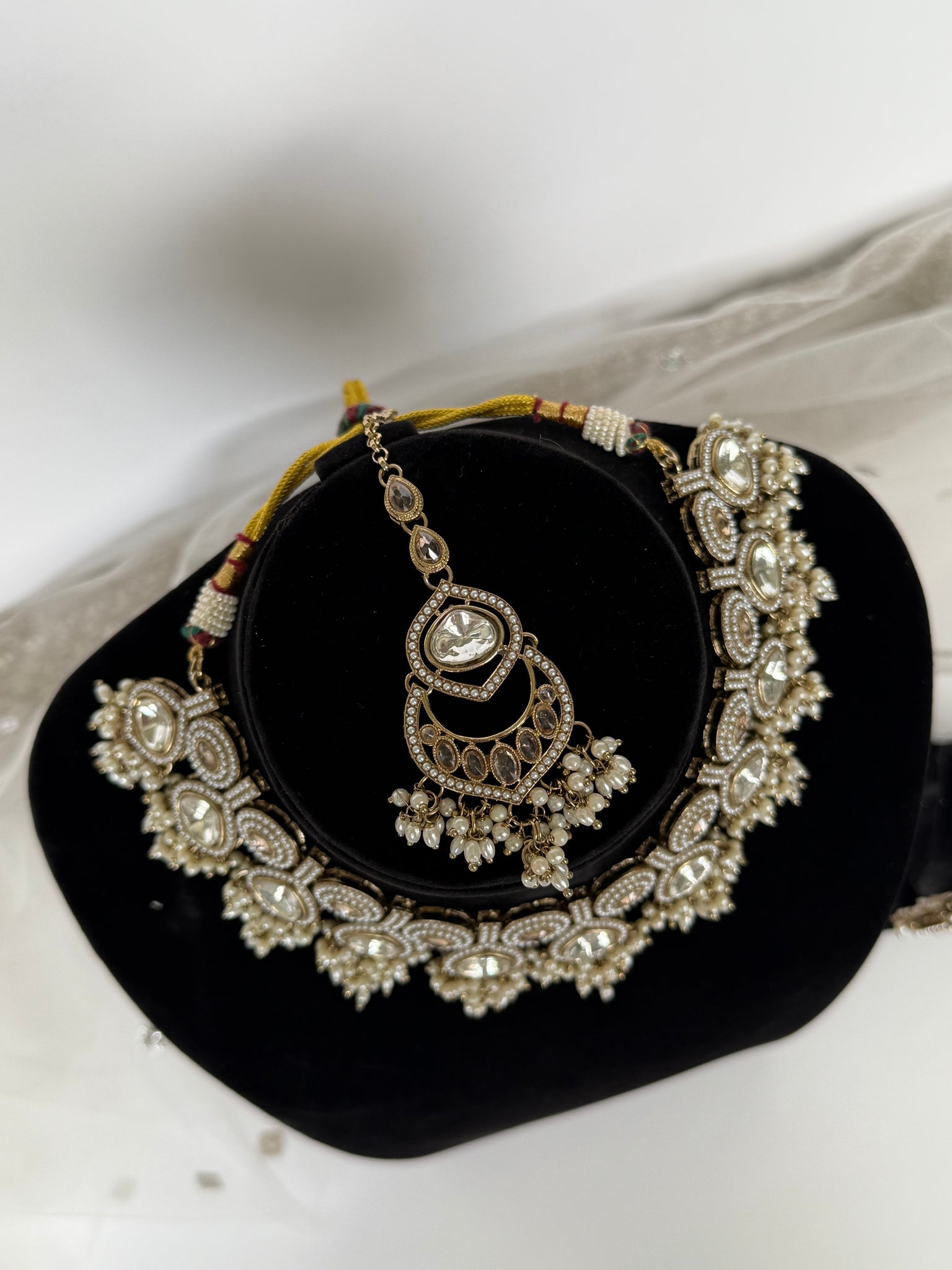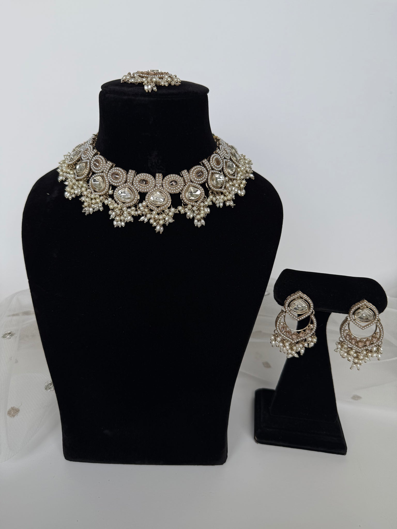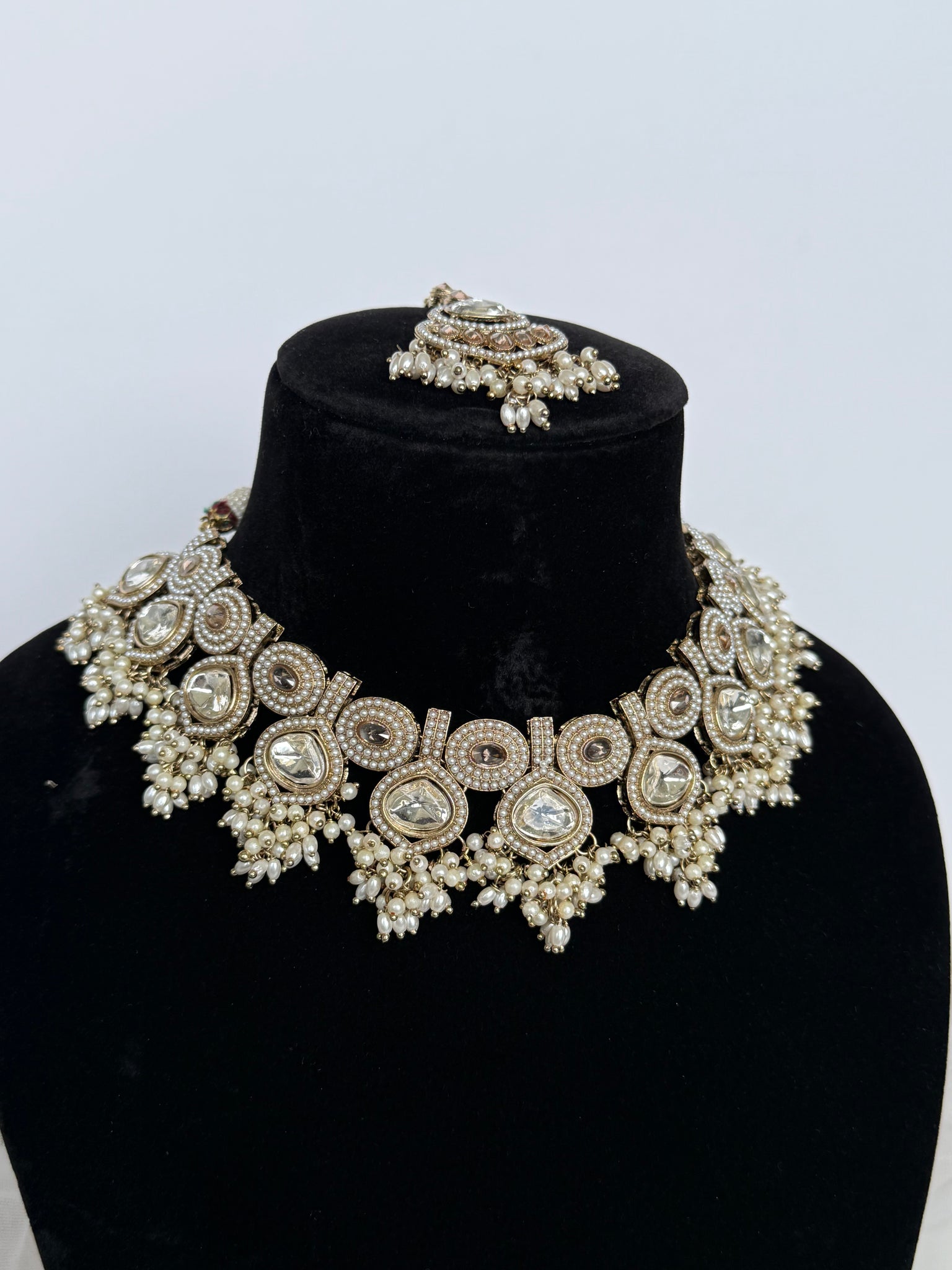 Gorgeous pearl with gold uncut kundan necklace set with earrings and tikka