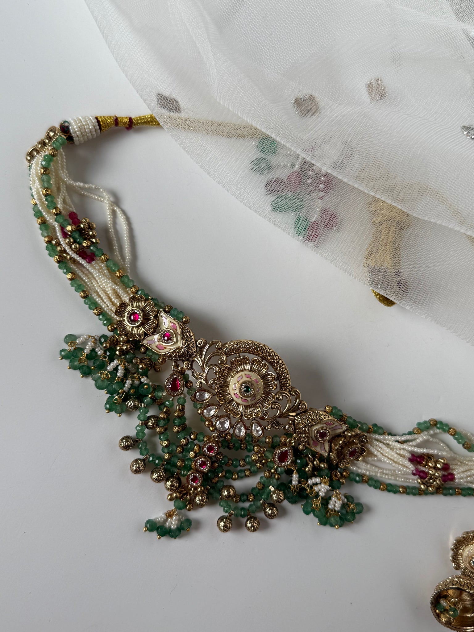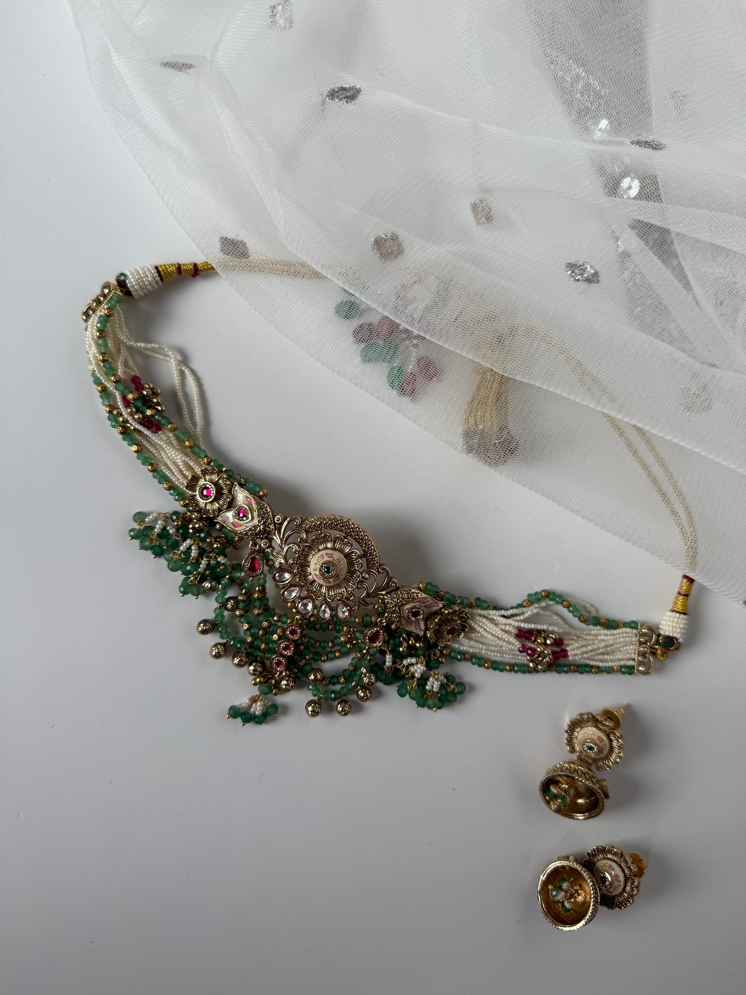 Gorgeous hand painted sage green meenakari kundan set with tiyani kundan, choker set comes with small jhumkis