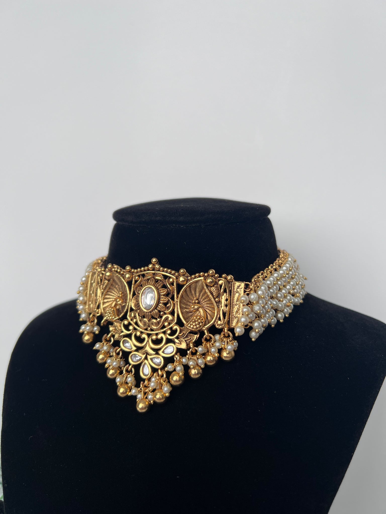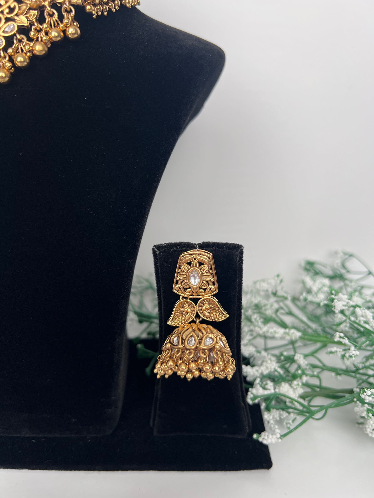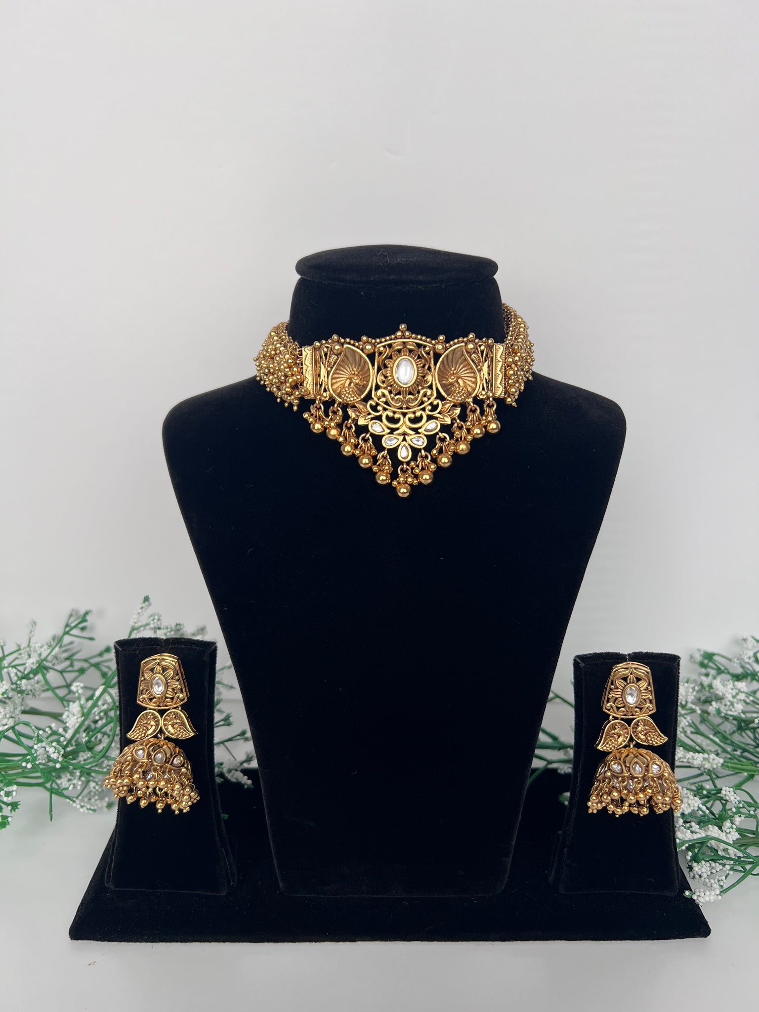 Antique gold choker set with jhumki earrings and kundan work, 22K gold plated set in 2 styles.