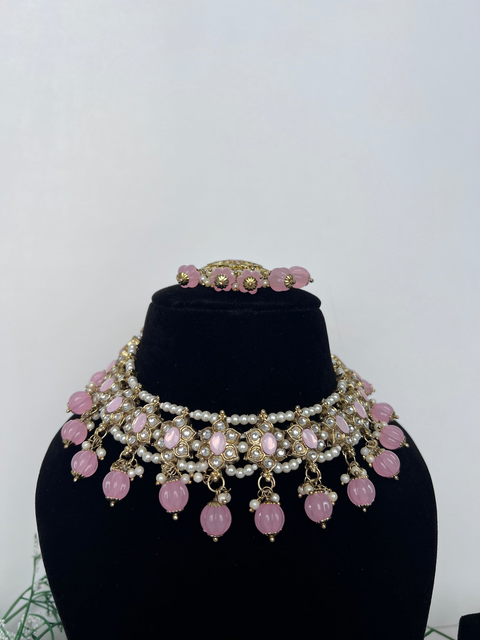 Stunning baby pink necklace with jhumki earrings and tikka! Comes with detachable sahare