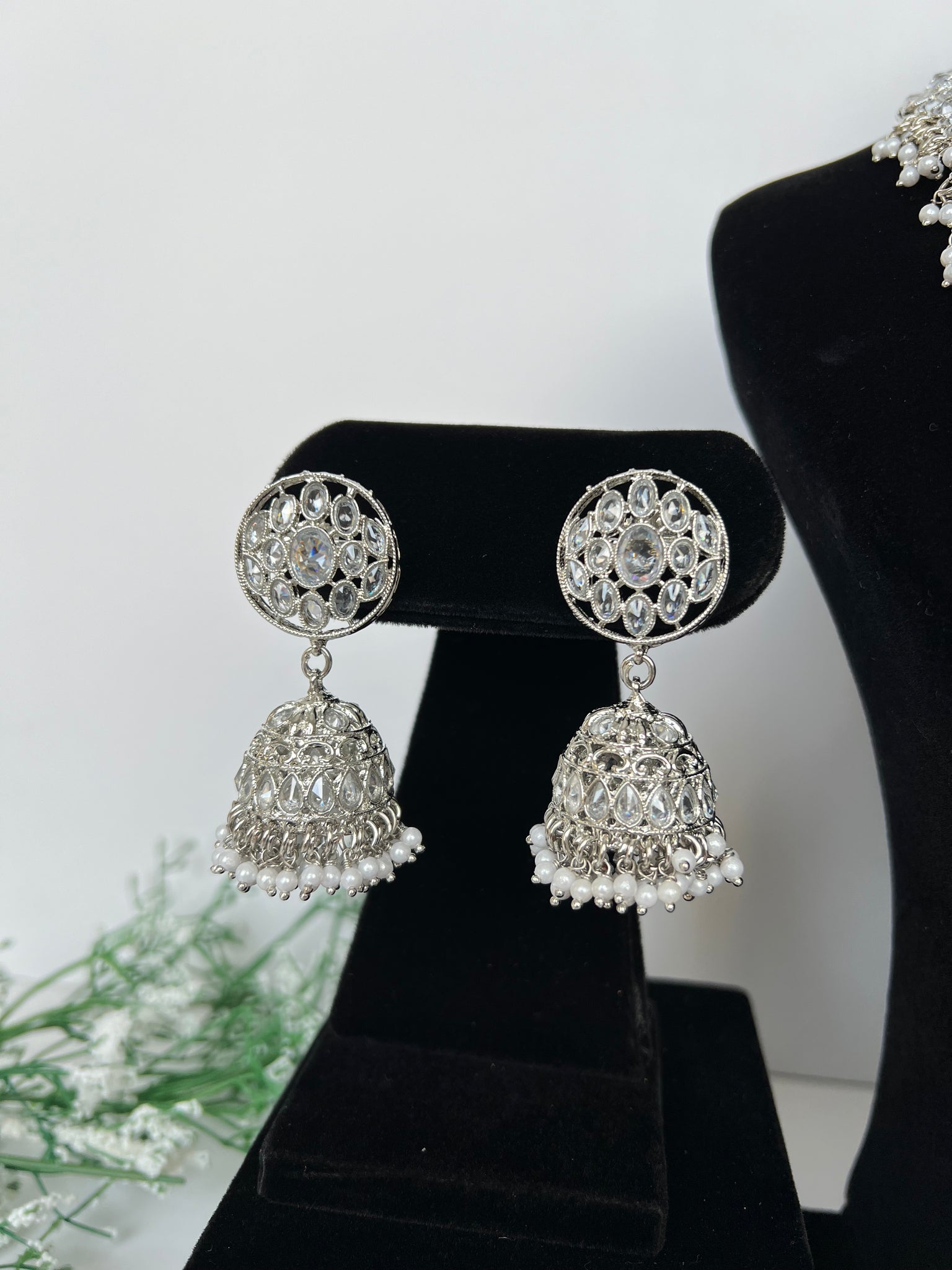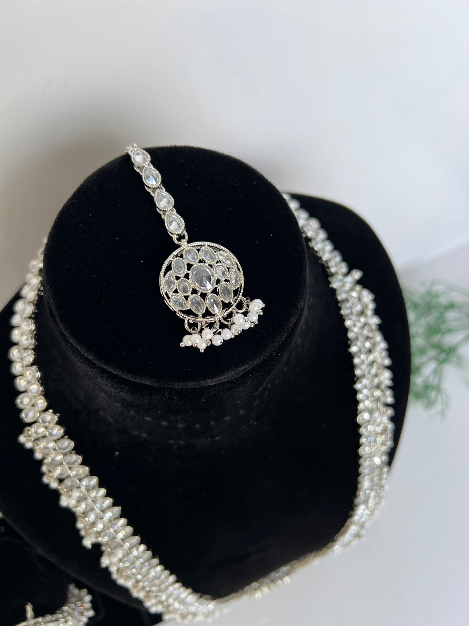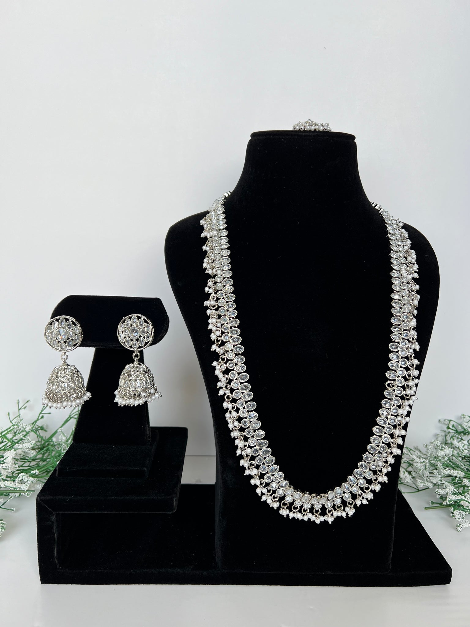 Beautiful long necklace set with jhumki and tikka. 2 colours available