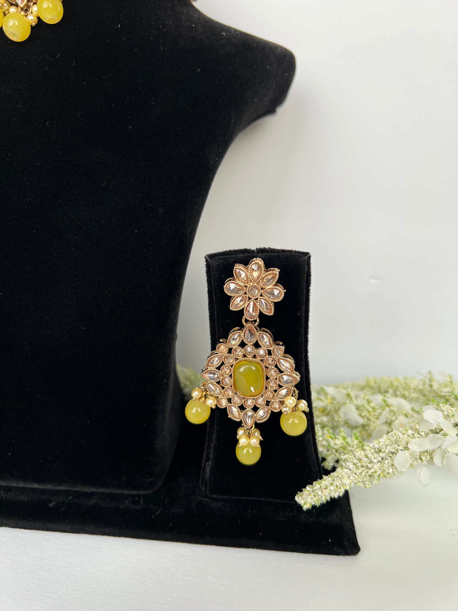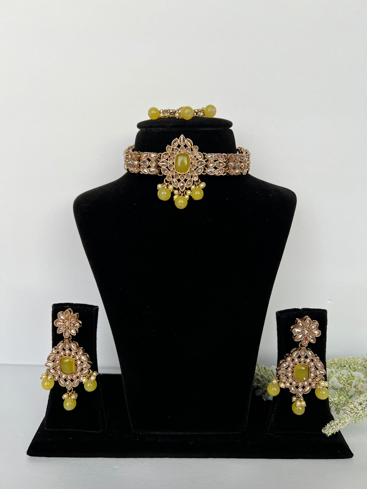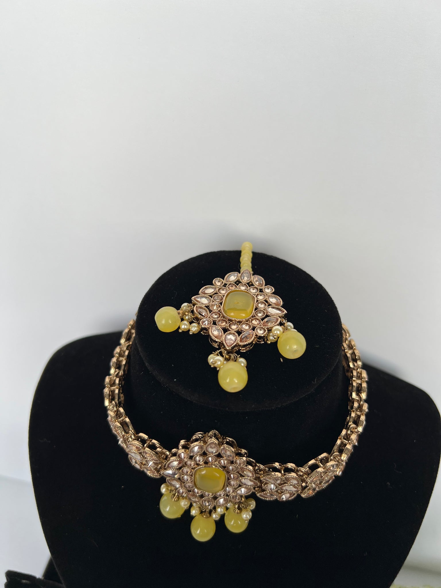 Simple and elegant polki stone choker set with lightweight earrings and tikka In yellow