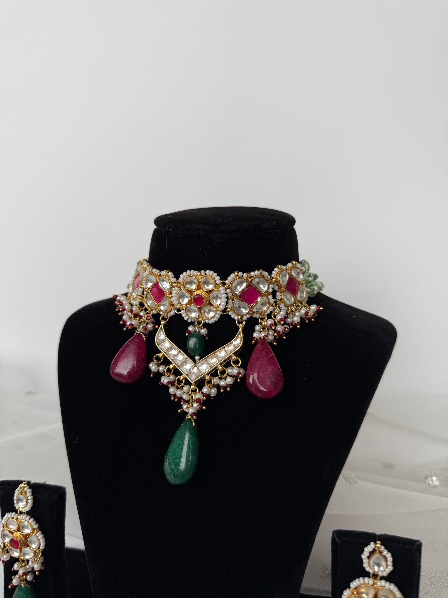 Stunning pachi kundan gold plated set in ruby and greenstones with earrings