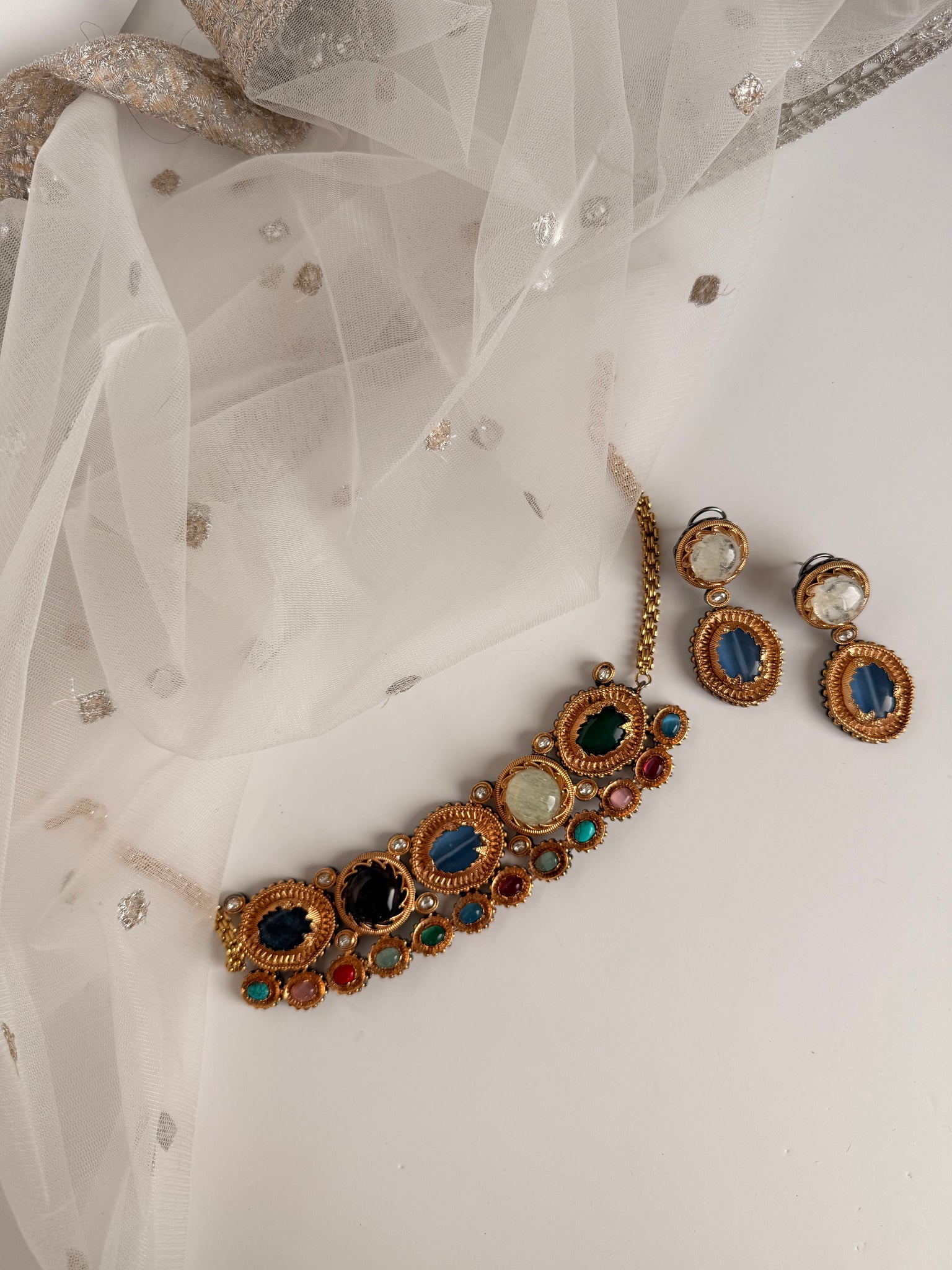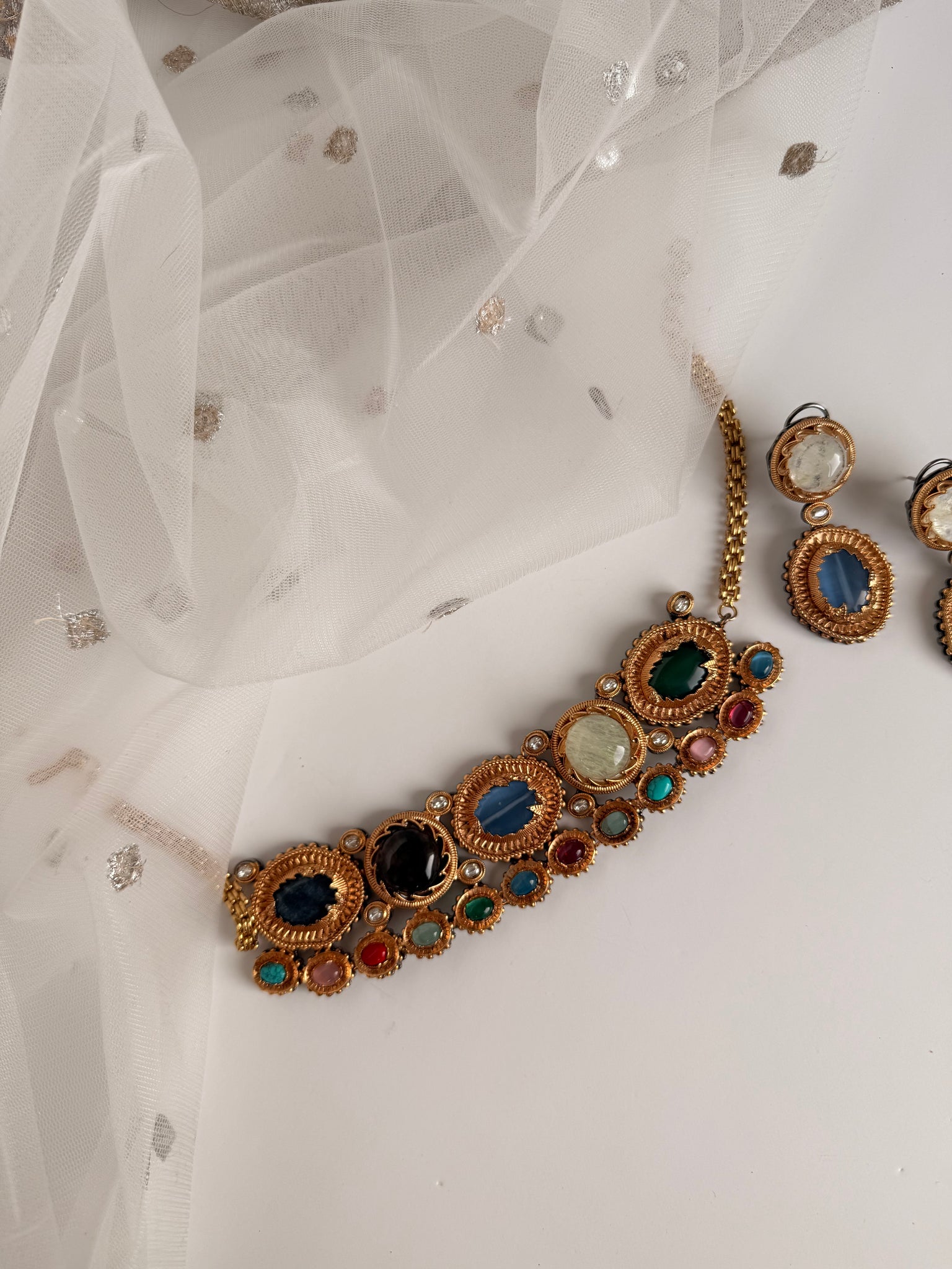 Beautiful pearl and real stone work choker set in tiyani with moissanite stone work. Hand crafted, finished with real pearls. Comes with earrings