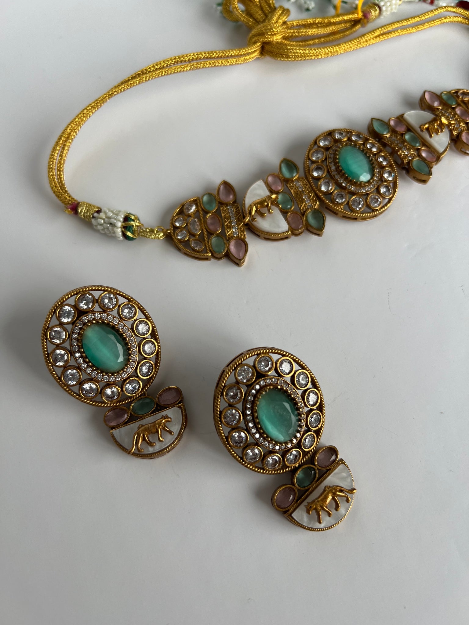 Stunning Tiyani kundan sabyasachi choker set with earrings. Lightweight, in baby blue and baby pink contrast