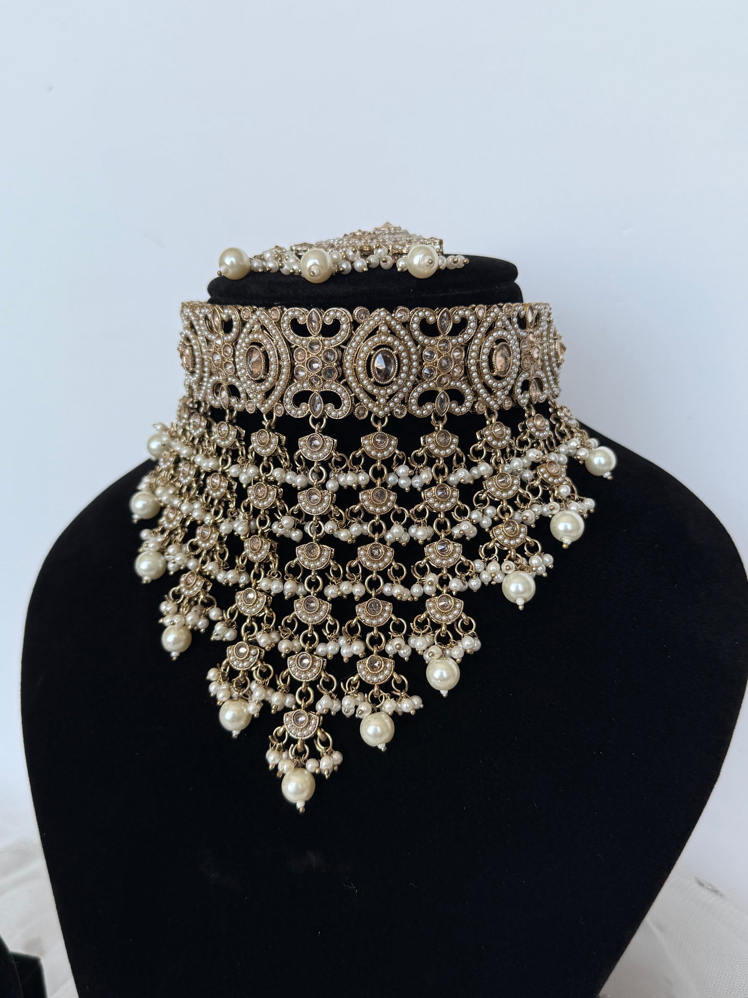 Gorgeous sage green and emerald green pearl detailed choker set with gorgeous studs. Gold plated in pachi kundan