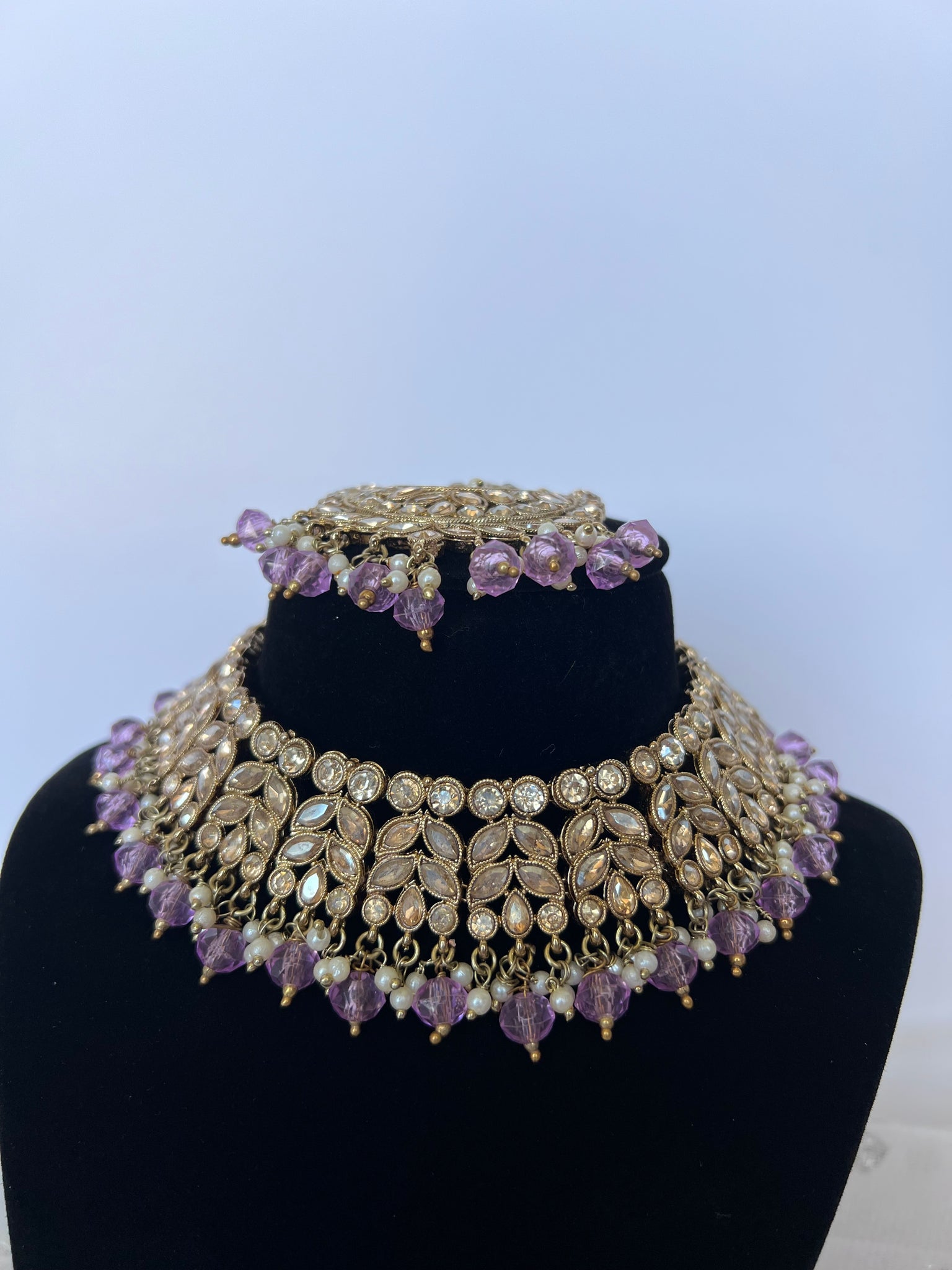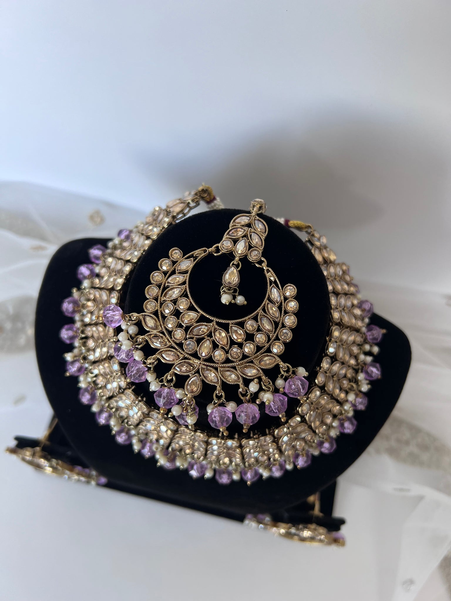 Stunning golden necklace set with lilac beading, comes with earrings and tikka