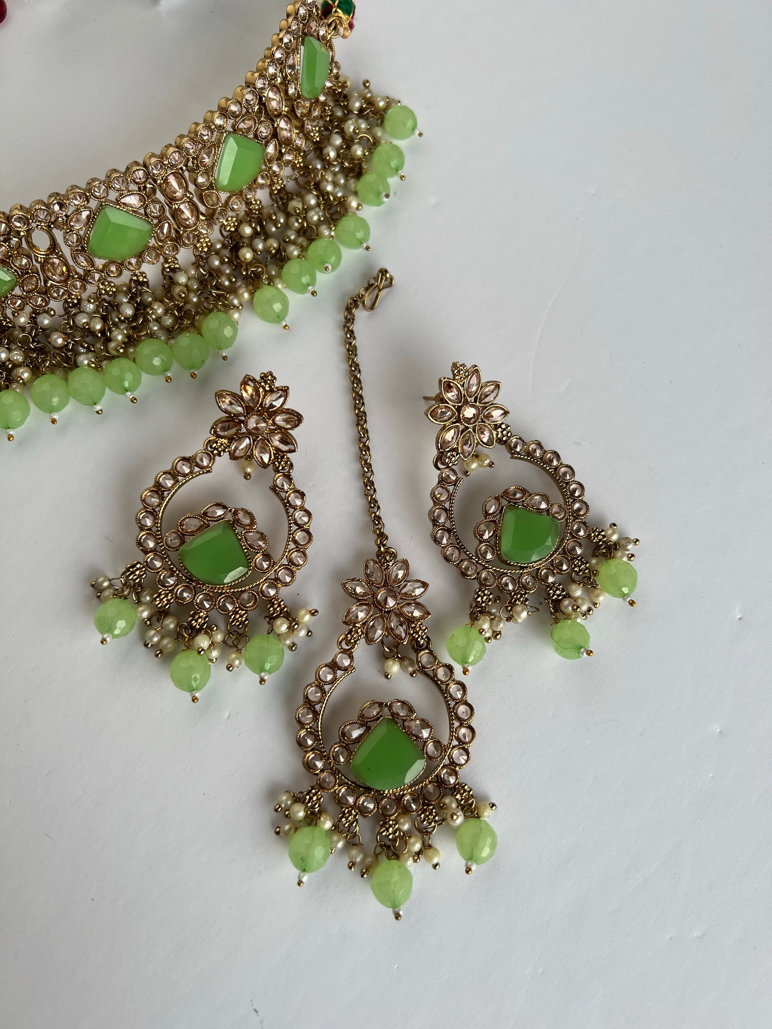A stunning gem stone mint green set with lightweight earrings and tikka to match