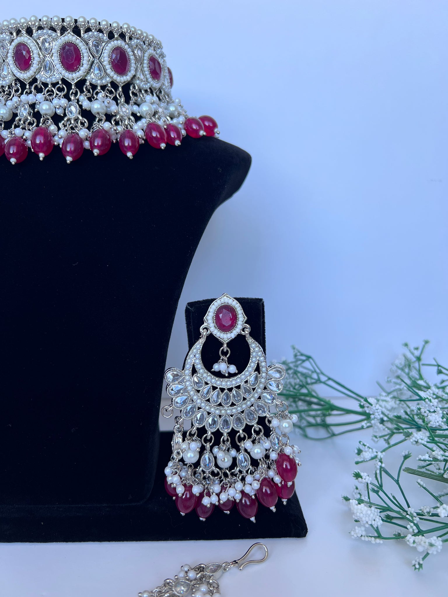 Beautiful silver with maroon choker set comes with earrings and tikka