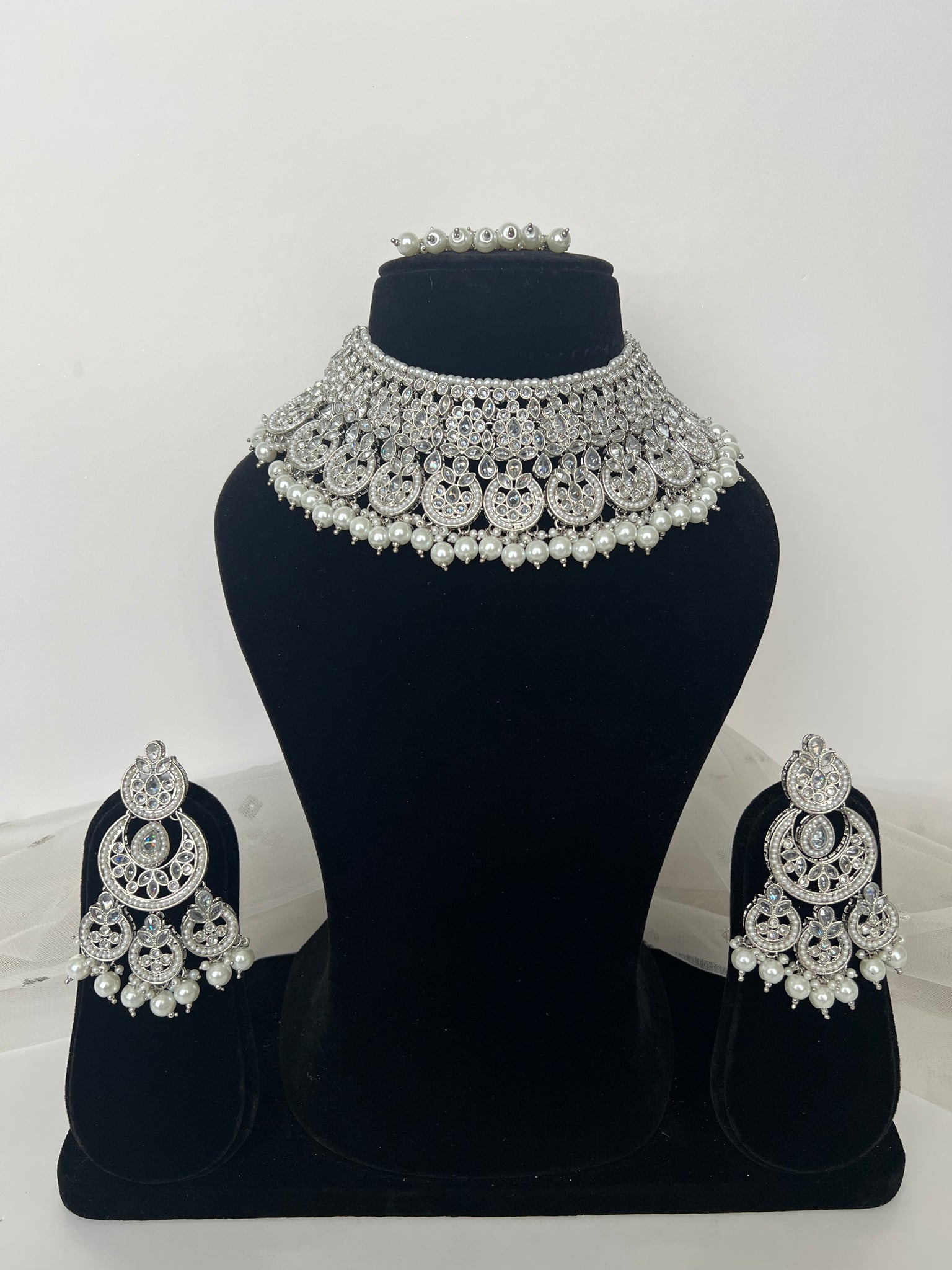 Beautiful silver necklace and choker bridal set with earrings and tikka
