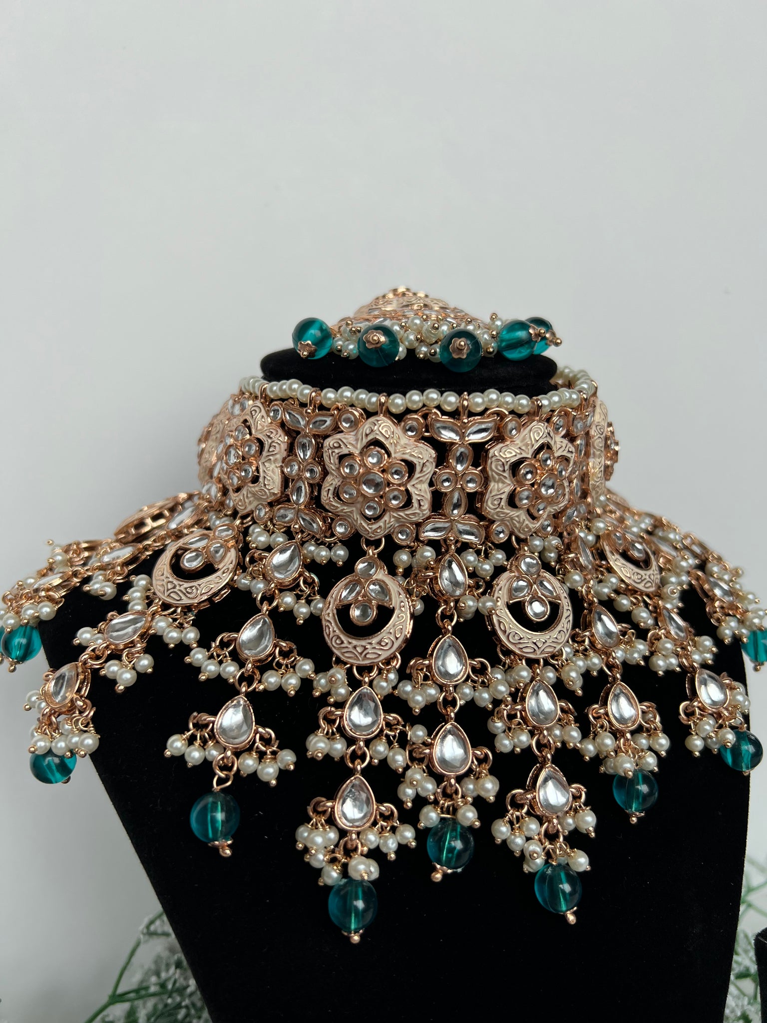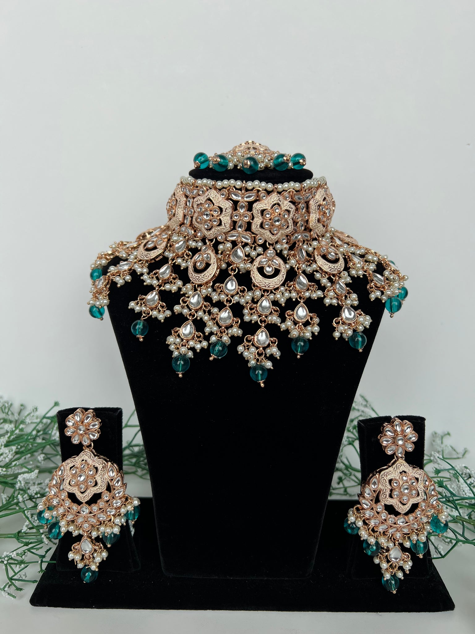 A stunning teal kundan Meenakari set, gold plated with a choker, earrings and tikka