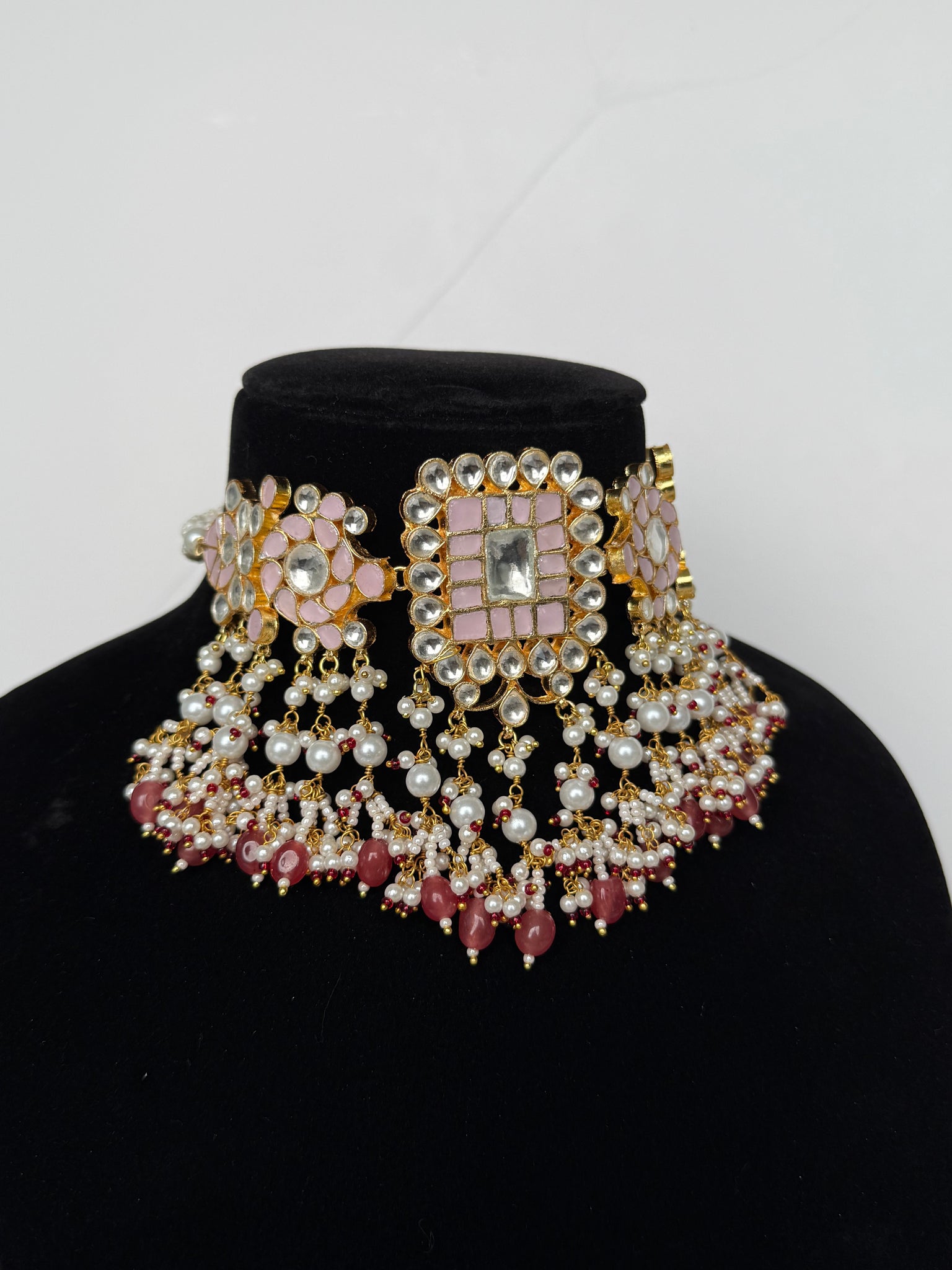 A gorgeous Pachi kundan choker set gold plated with pink accents and bead work. Comes with beautiful stud earrings