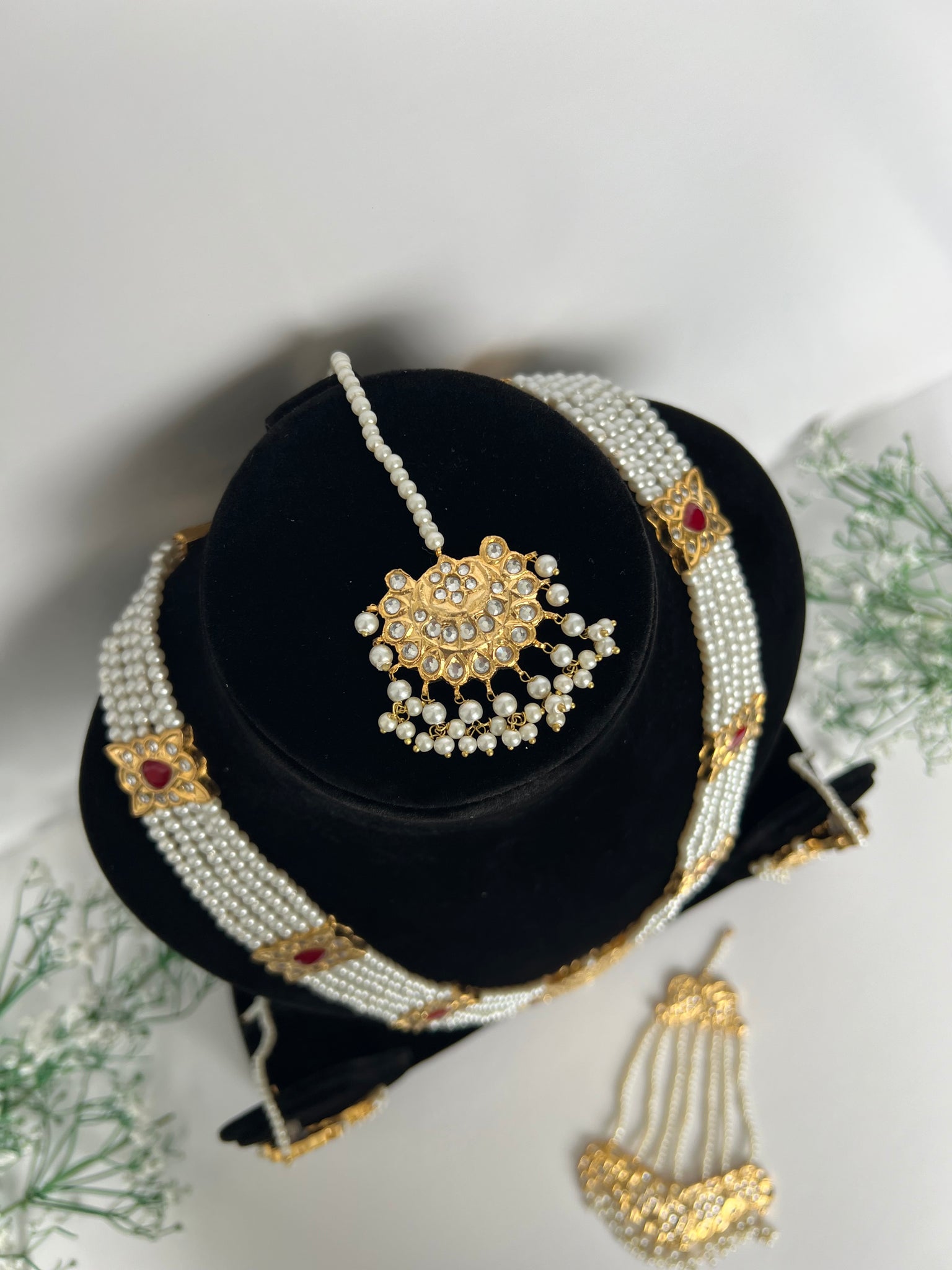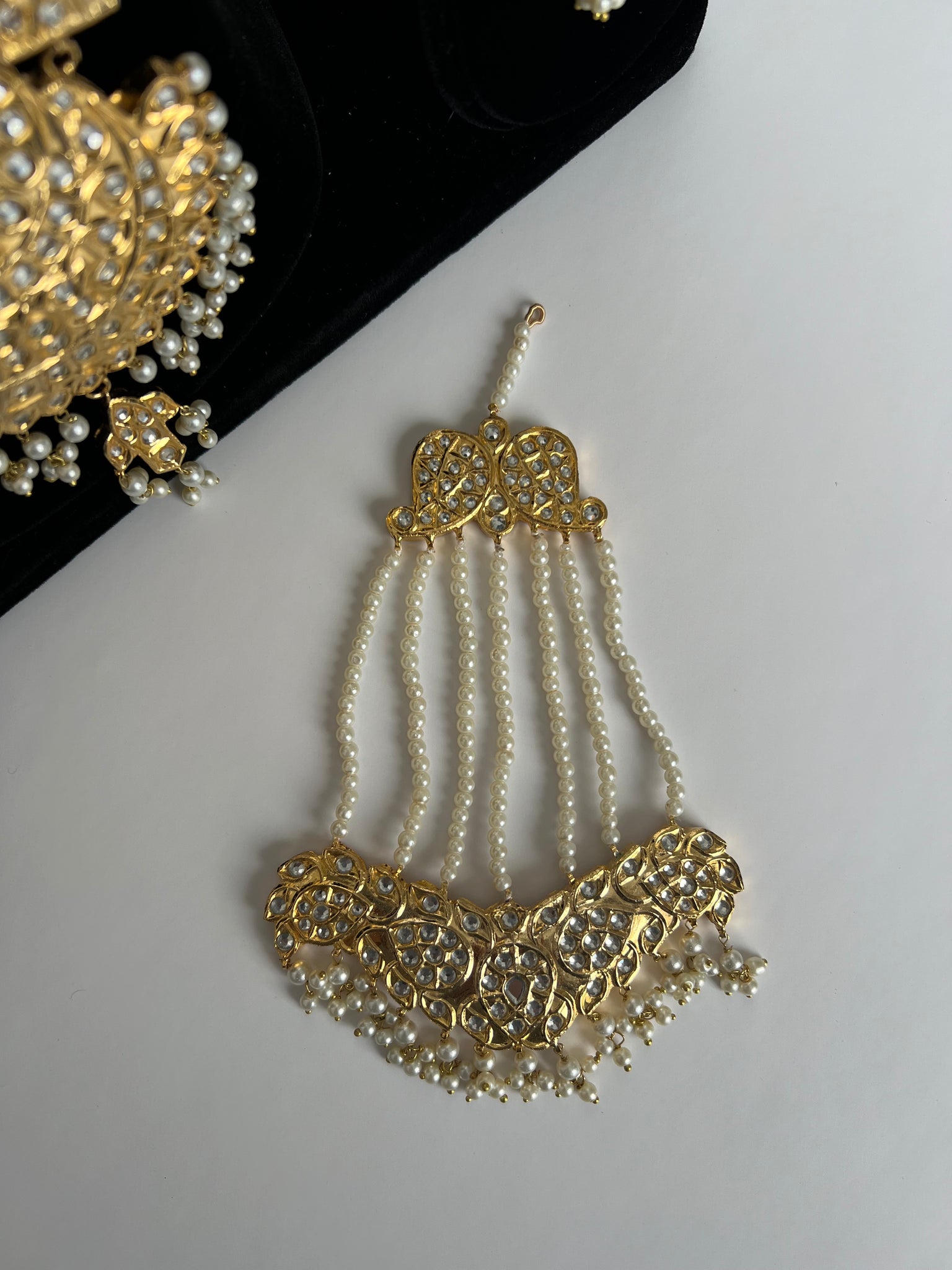 A stunning thappa kundan, 22K gold plated Pakistani style long necklace. Comes with stunning lightweight earrings, tikka and Jhoomer