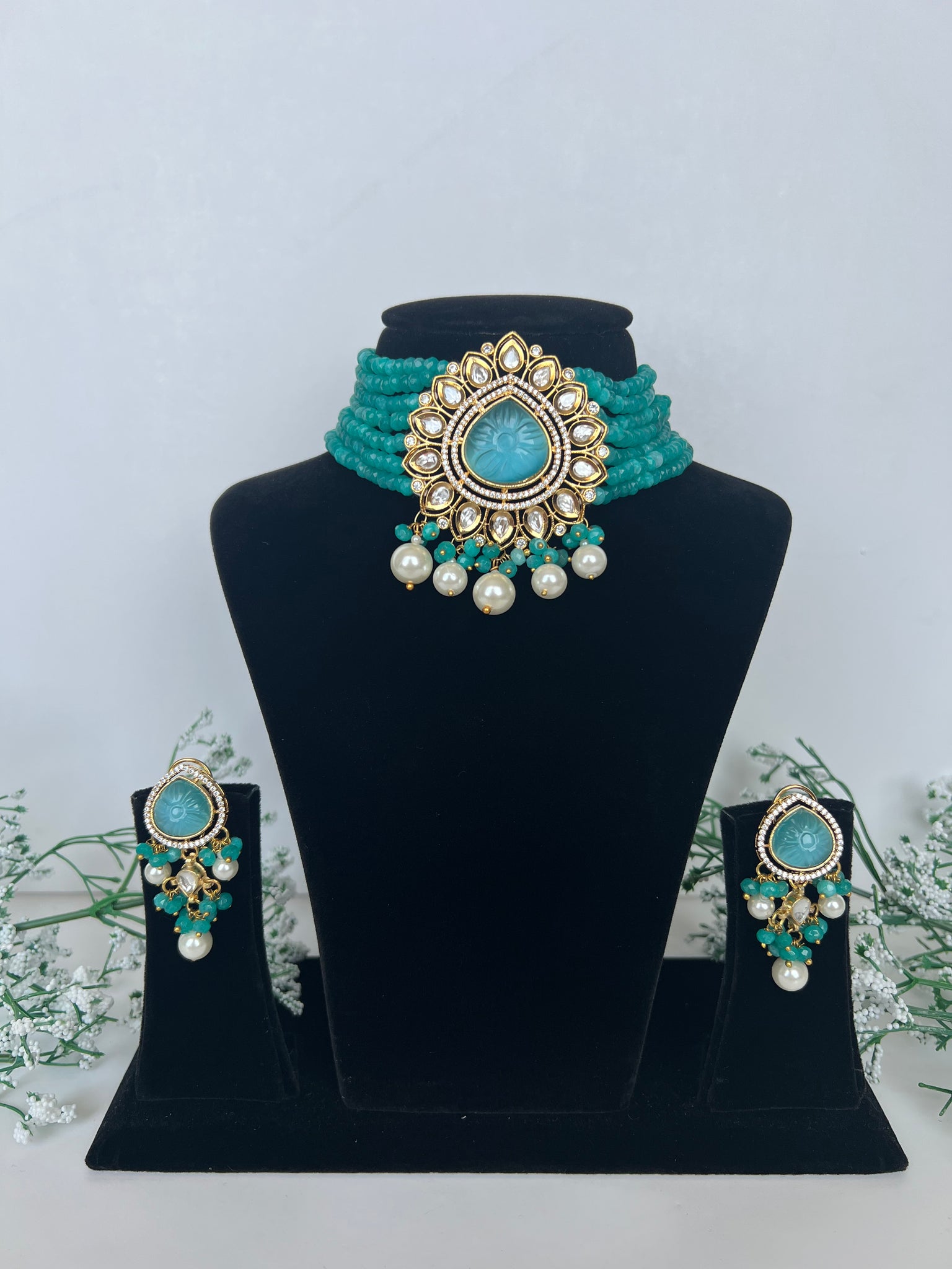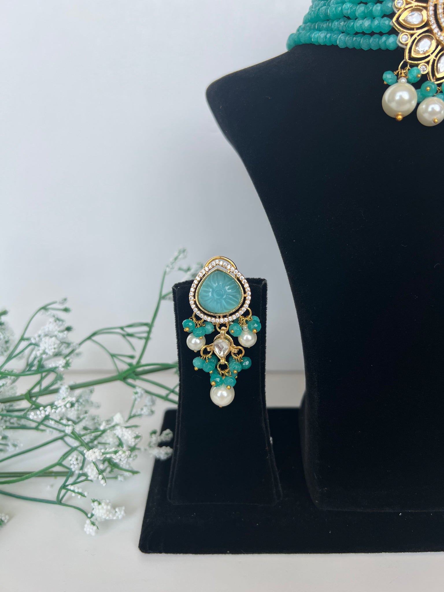 A vibrant teal blue set in Tiyani kundan with earrings and tikka. Is embellished with amarpali stones and 22k gold plated