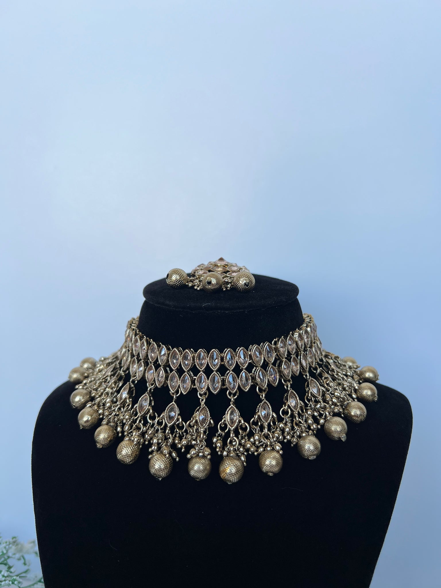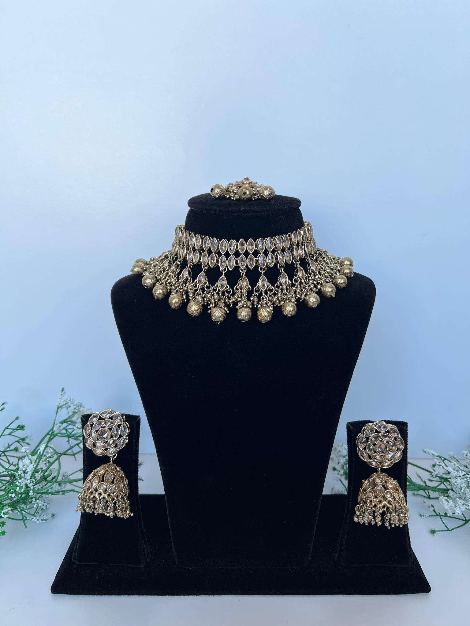 Stunning golden droplets choker set with jhumki and tikka