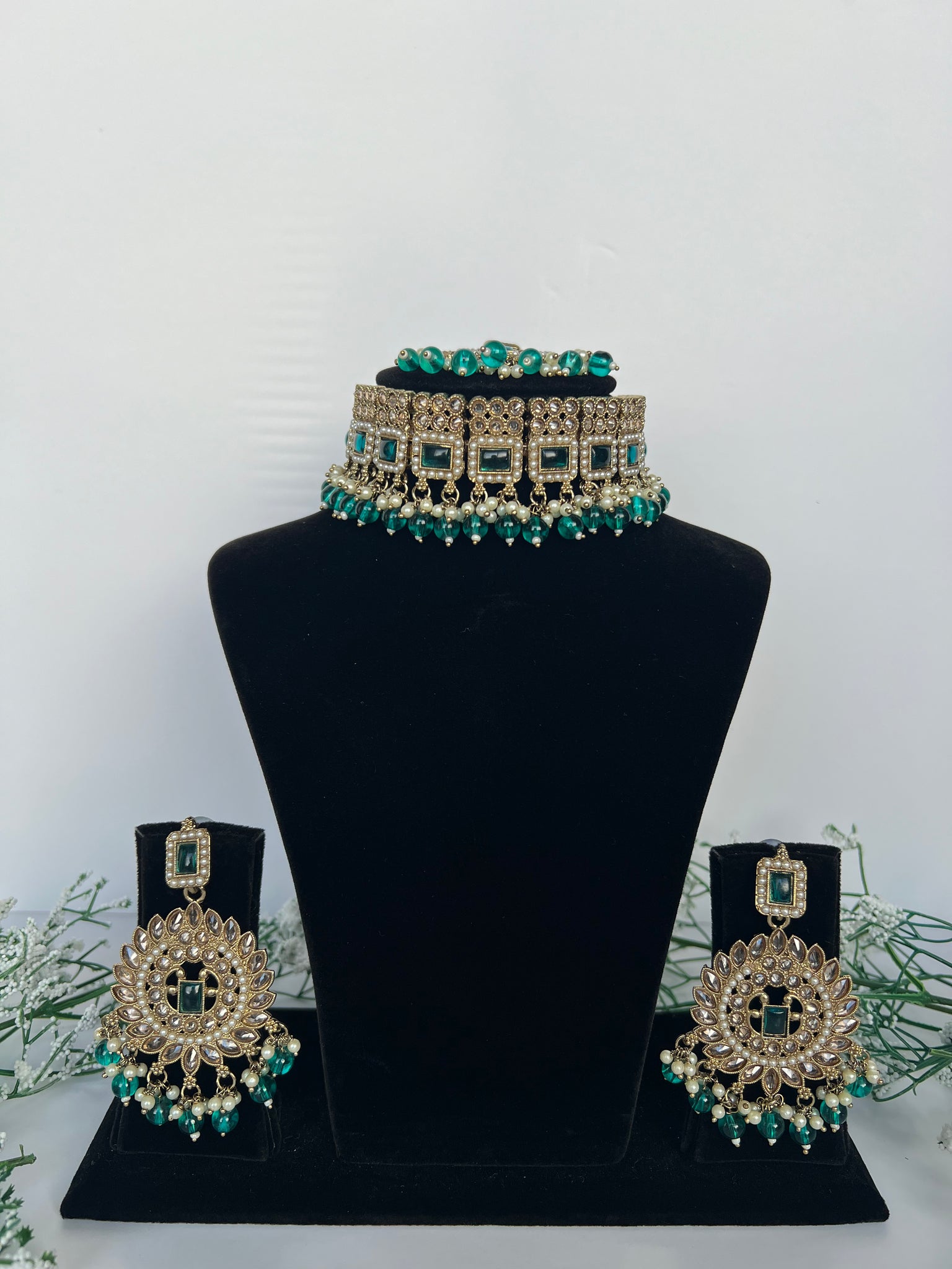 Teal blue choker with earrings and tikka