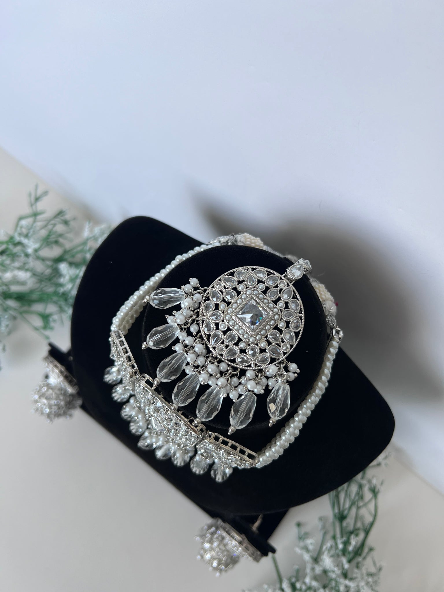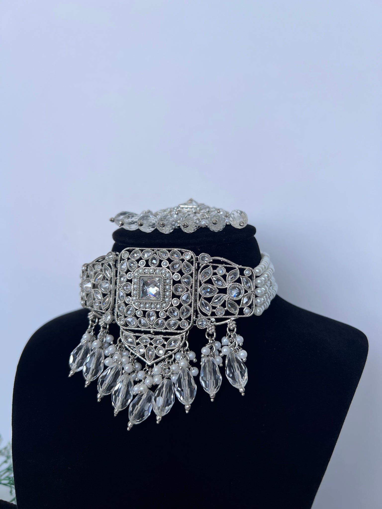 Stunning crystal beading silver choker with jhumki earrings and tikka