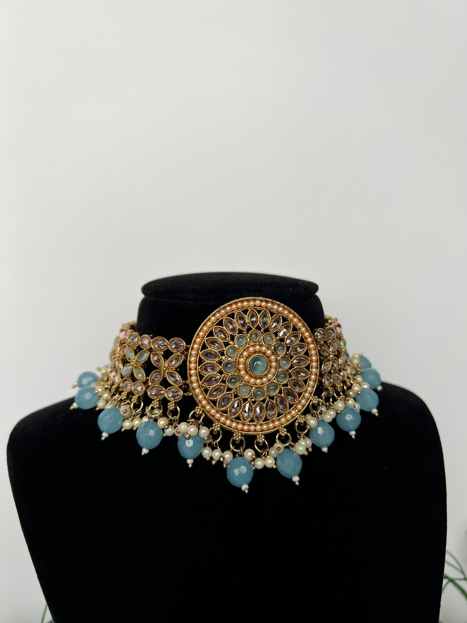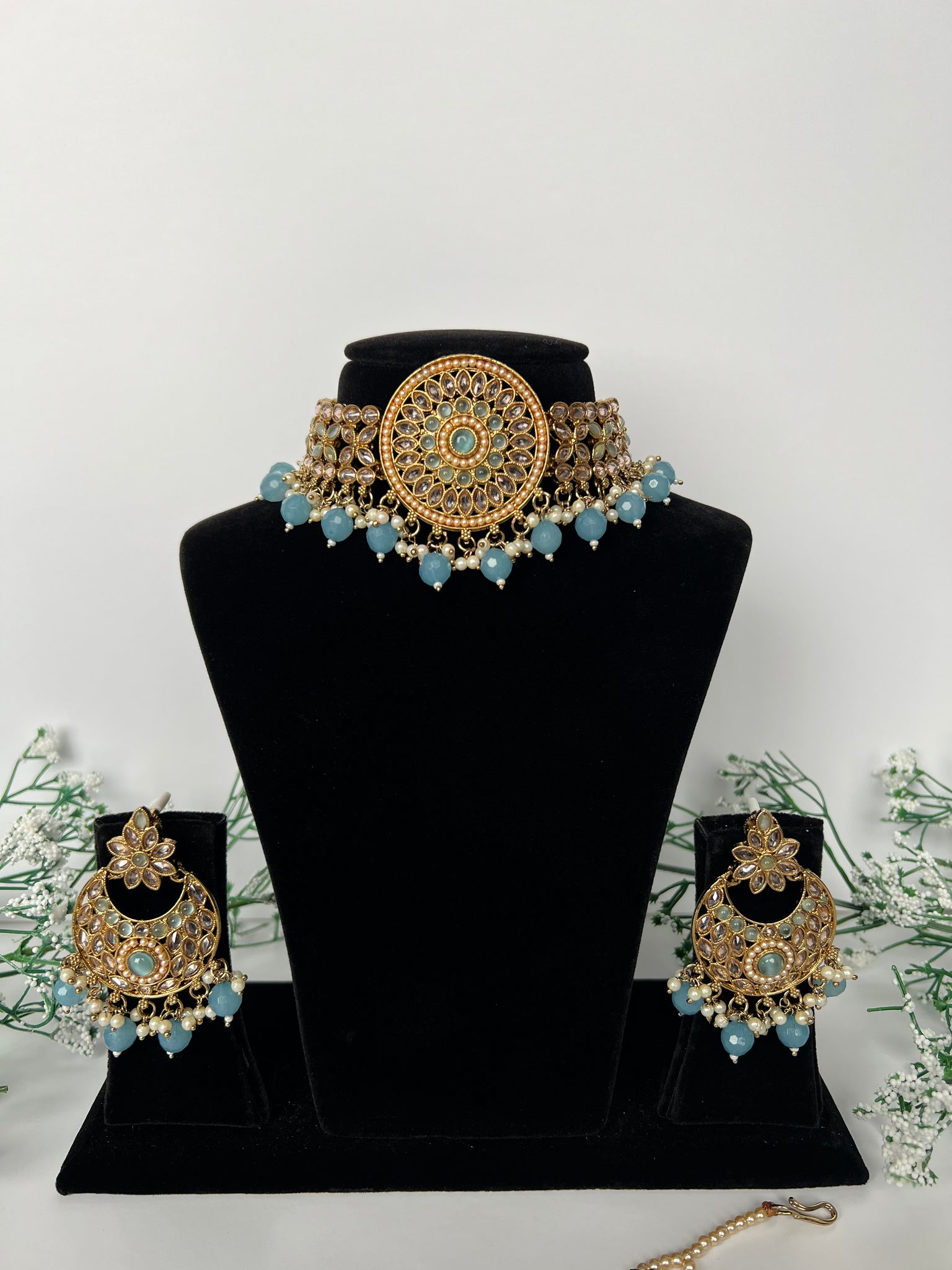 Baby blue choker set with earrings and tikka