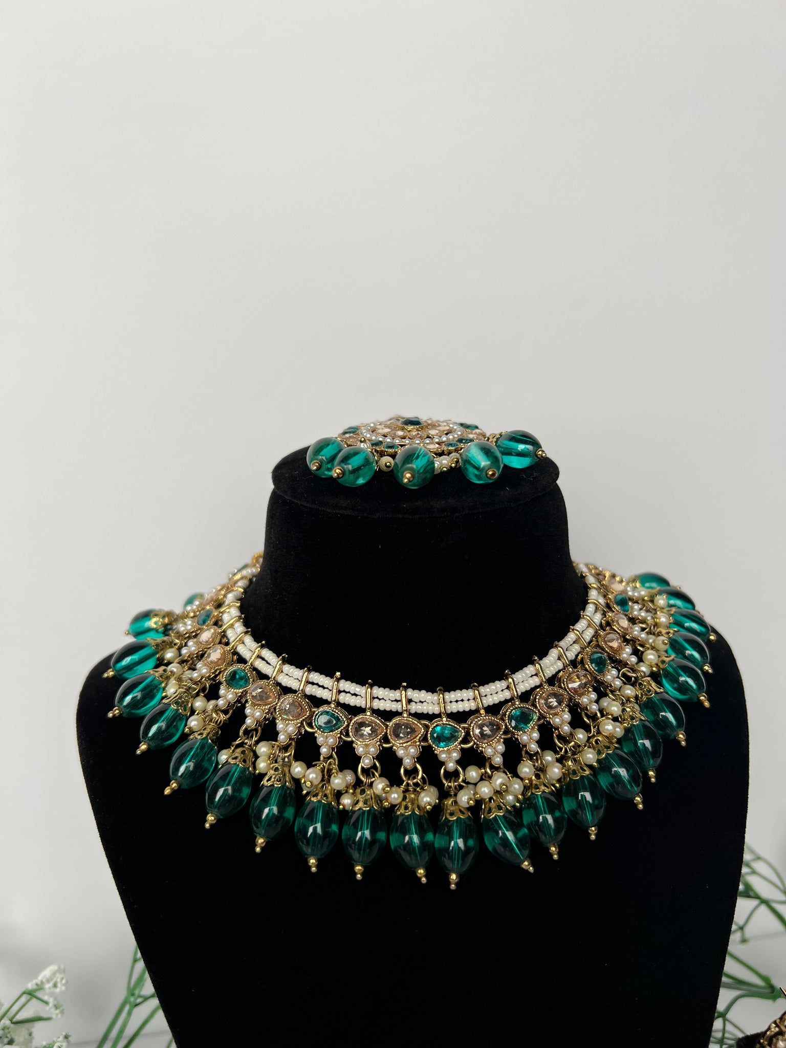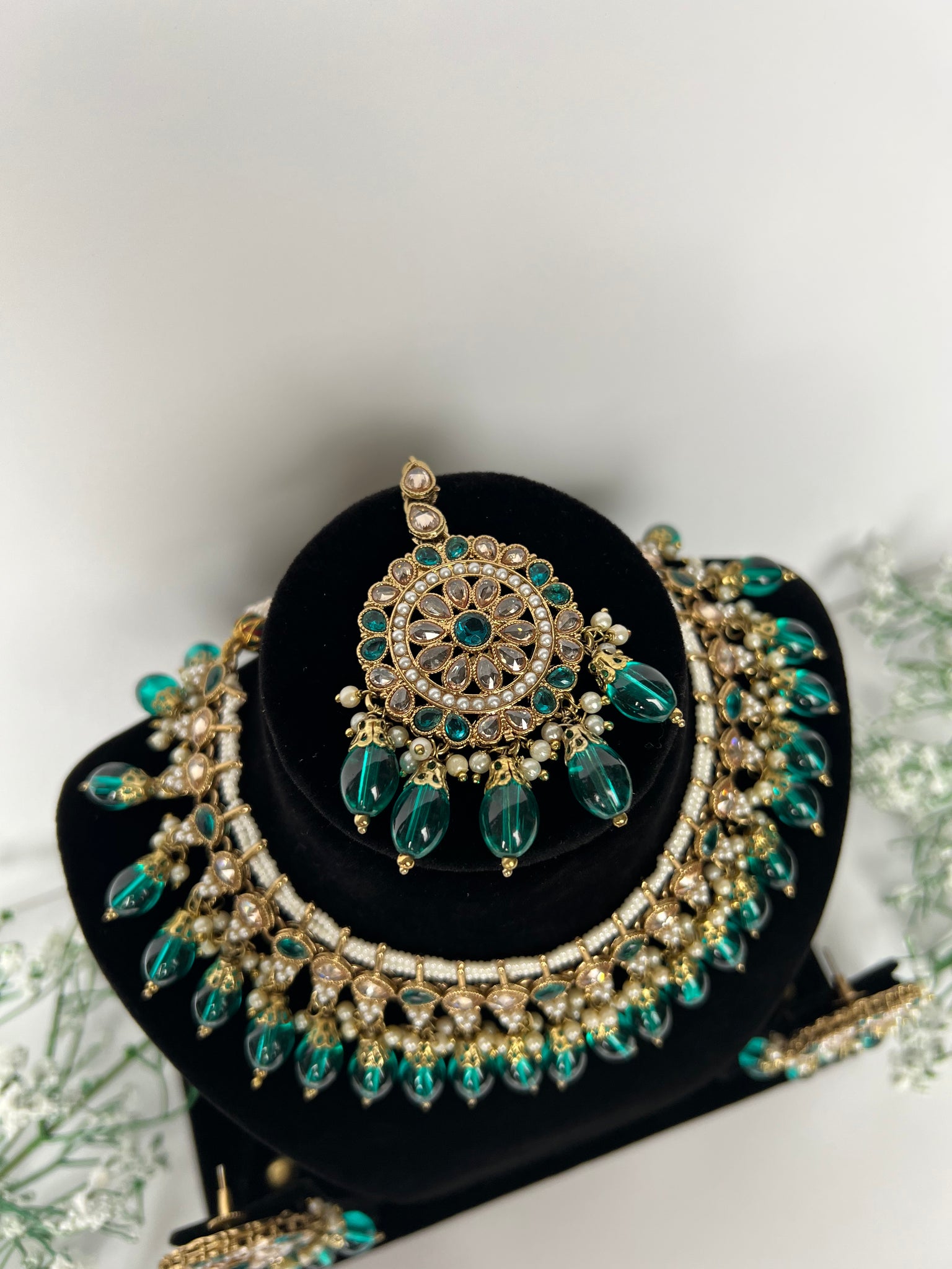 A stunning teal green/blue necklace set with stud earrings and tikka