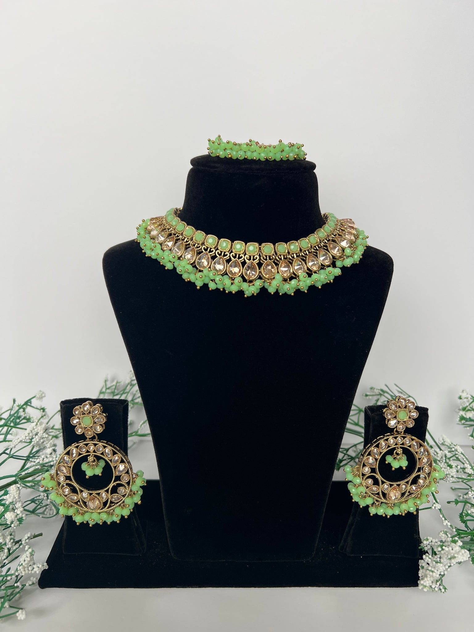 Mint necklace with earrings and tikka