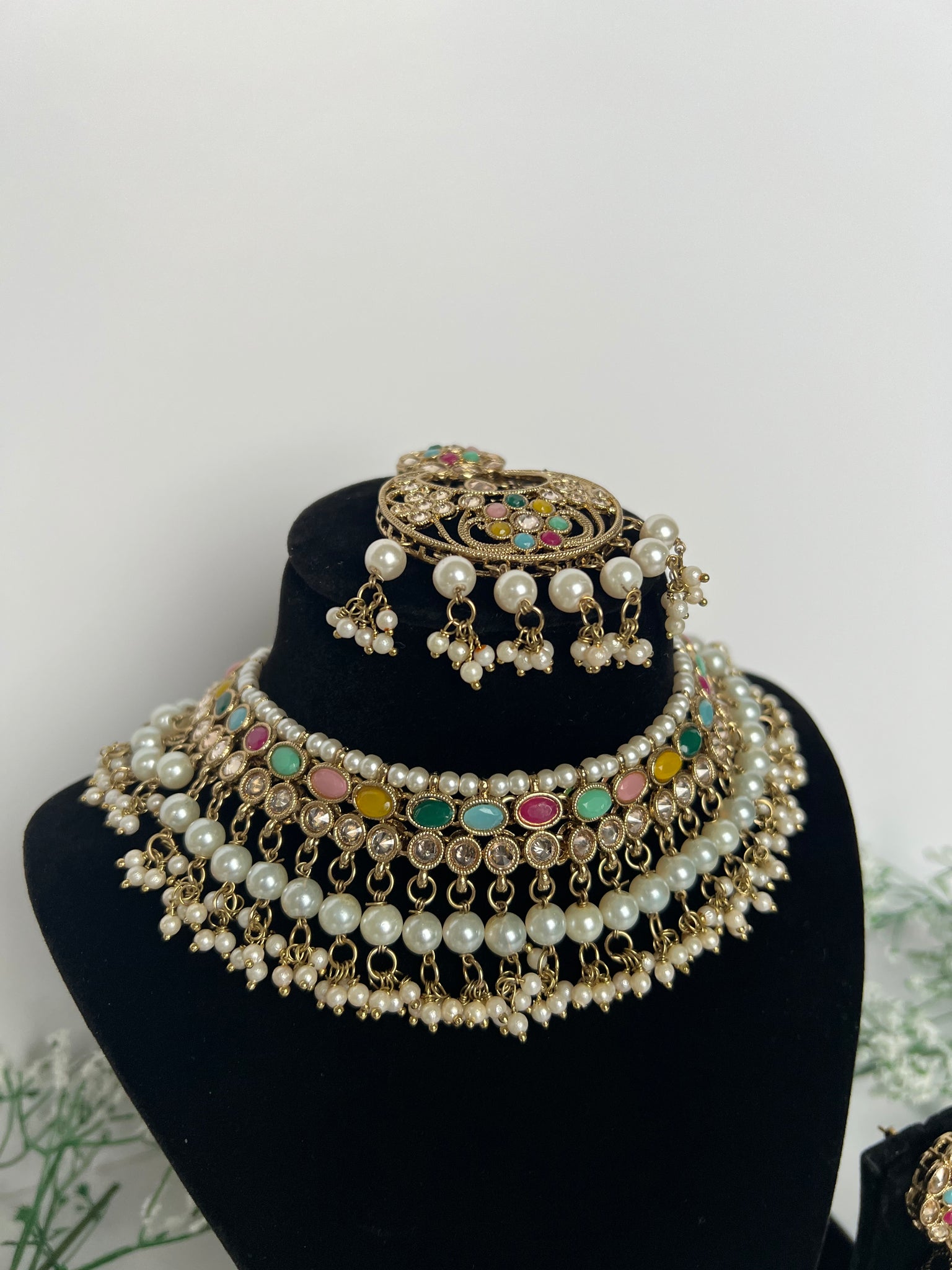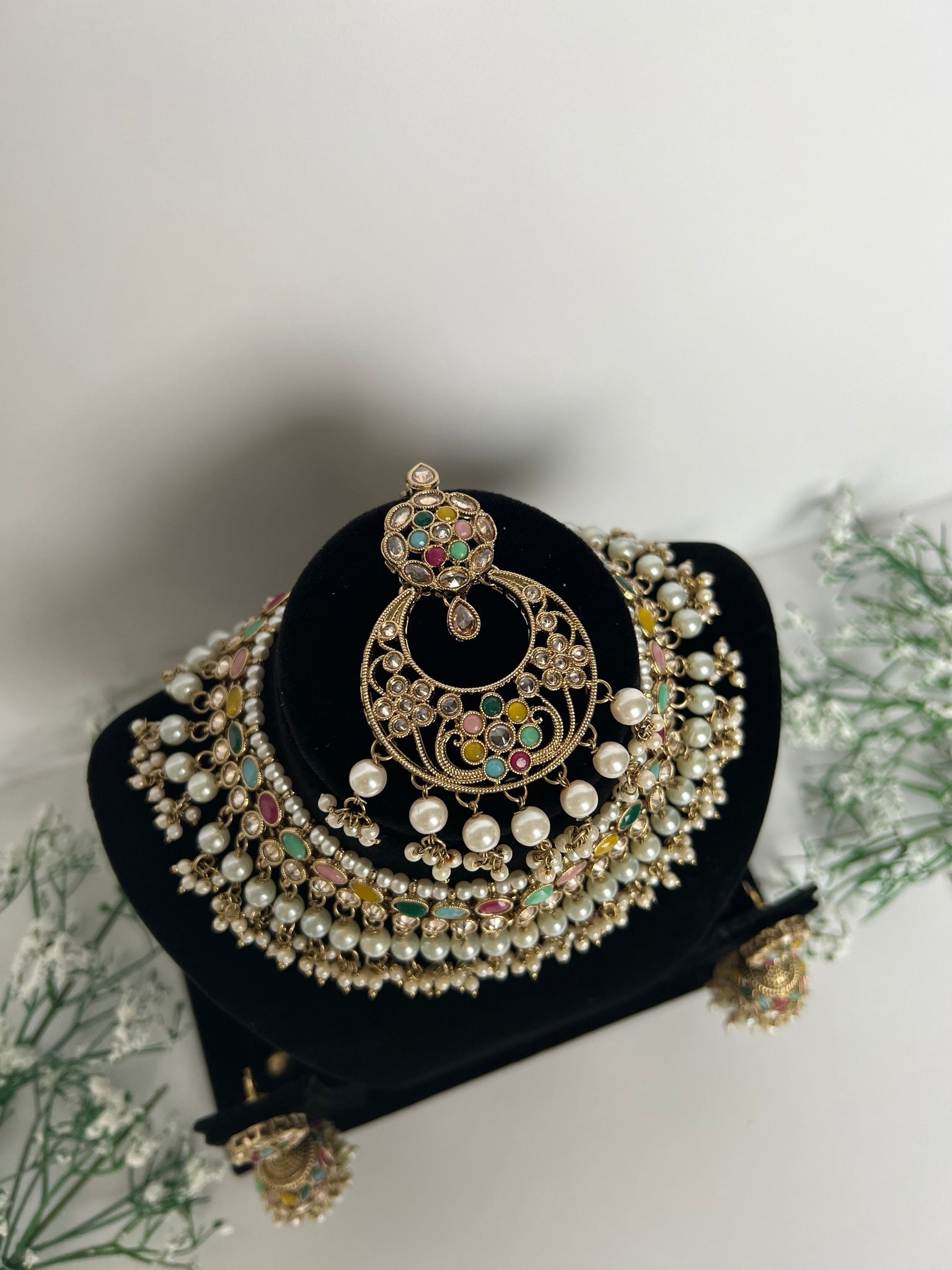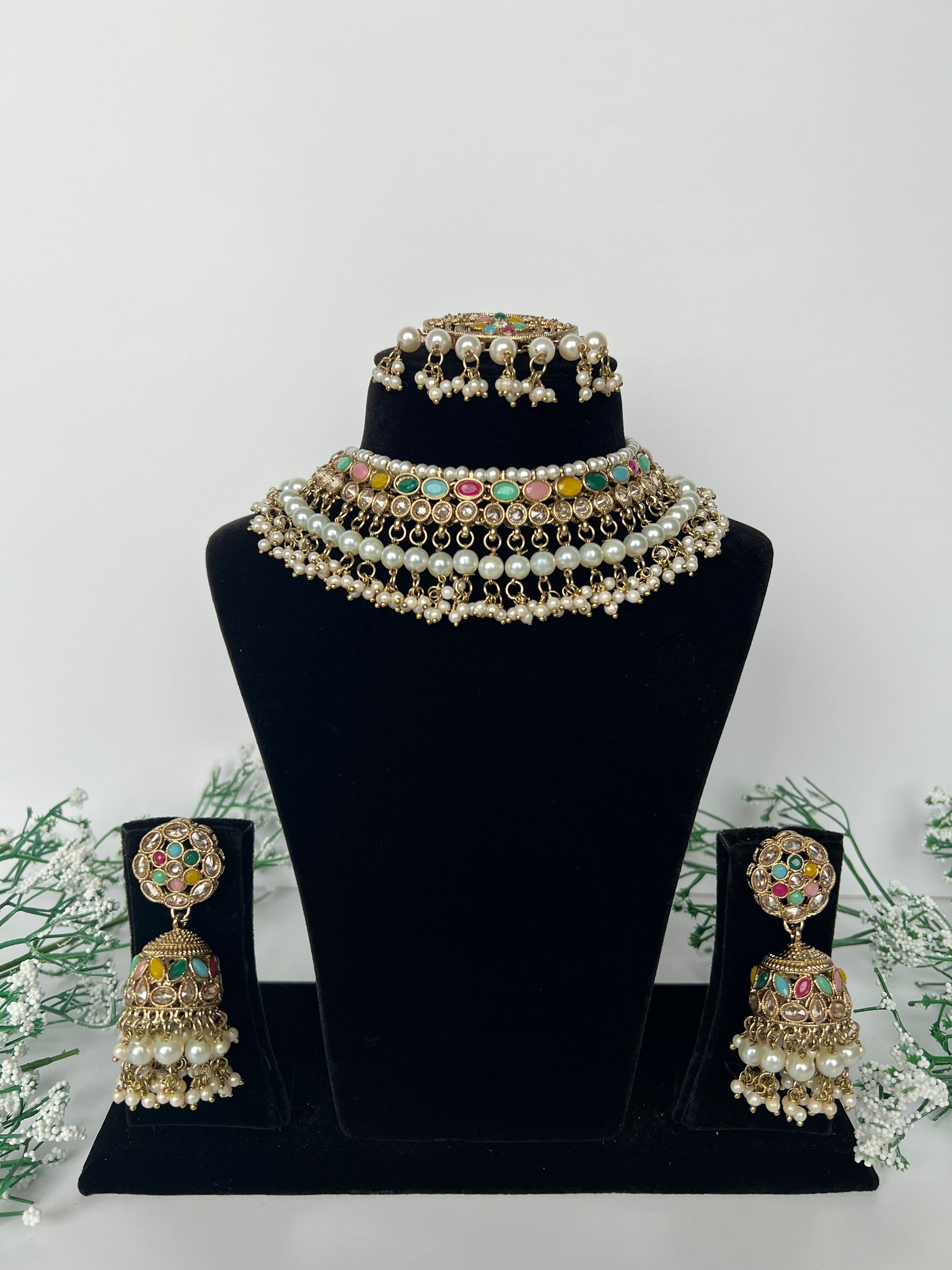Heavy multi coloured necklace set with stunning jhumki earrings that are lightweight, comes with a beautiful tikka