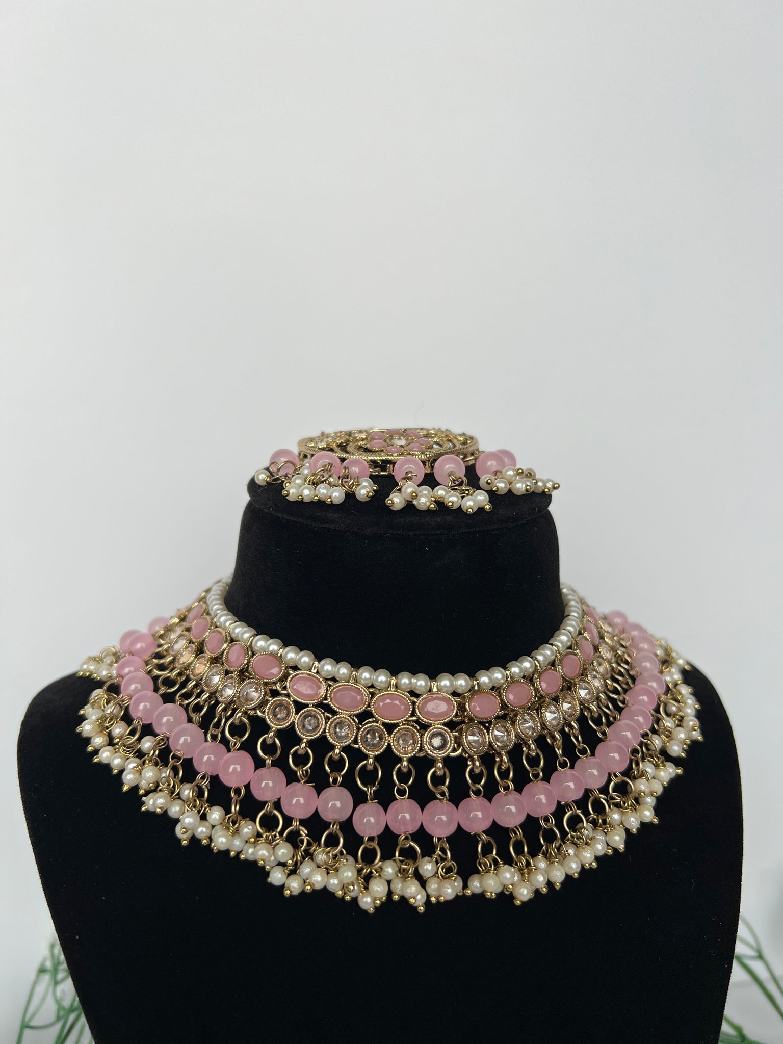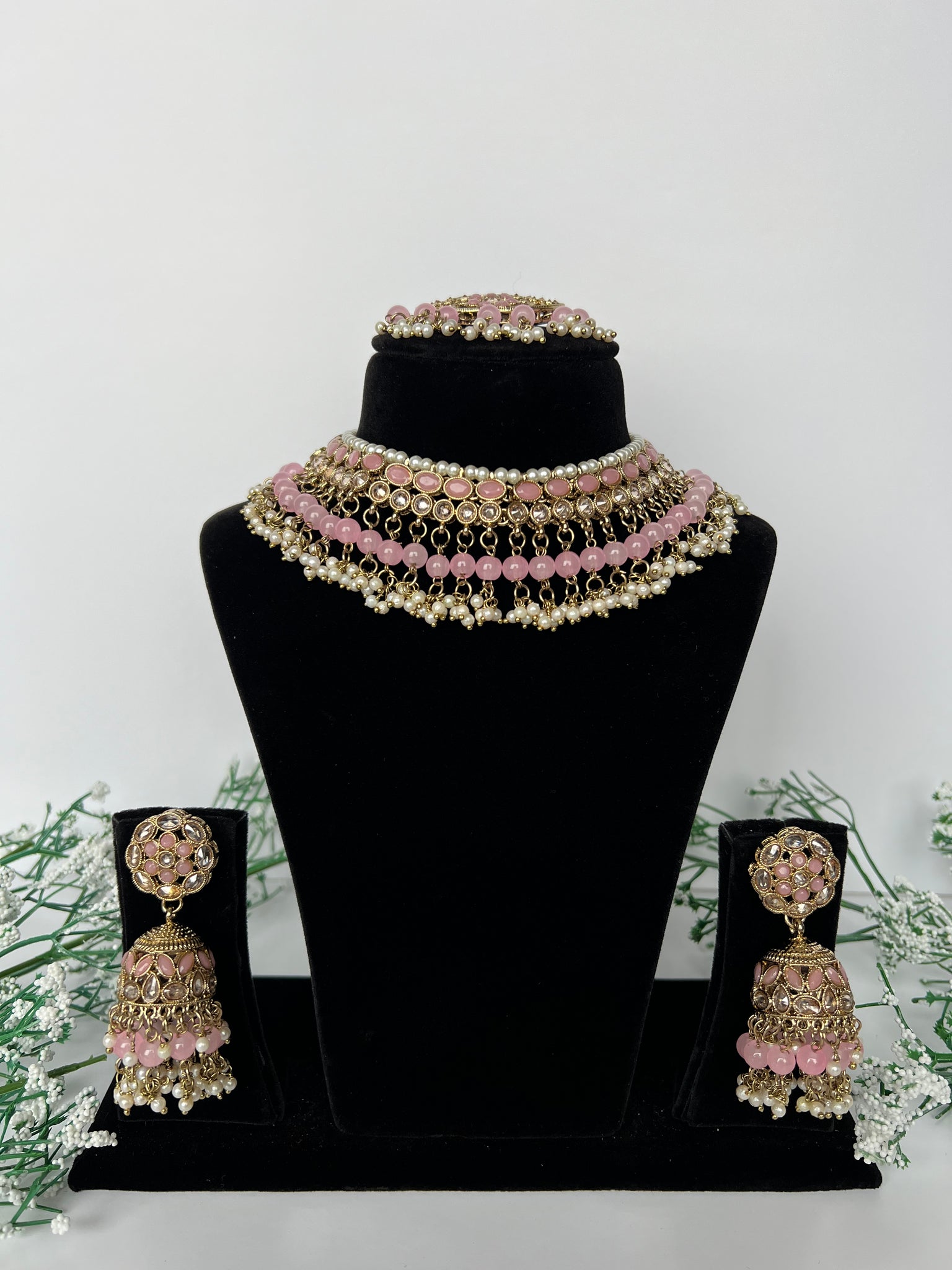 Heavy baby pink coloured necklace set with stunning jhumki earrings that are lightweight, comes with a beautiful tikka