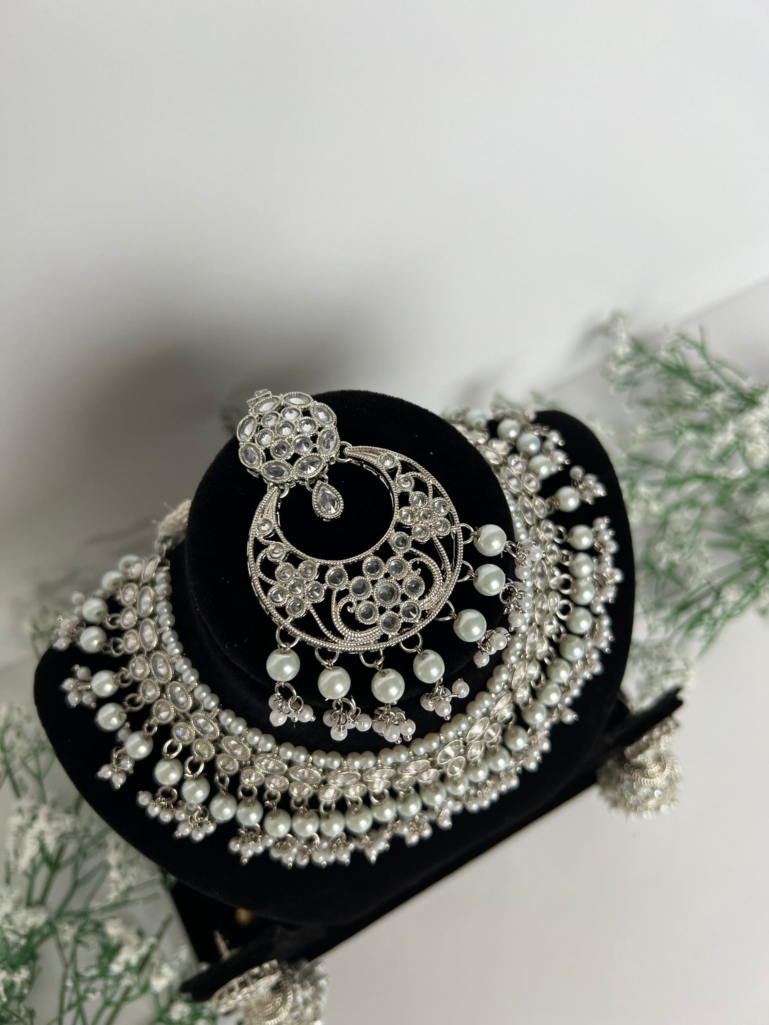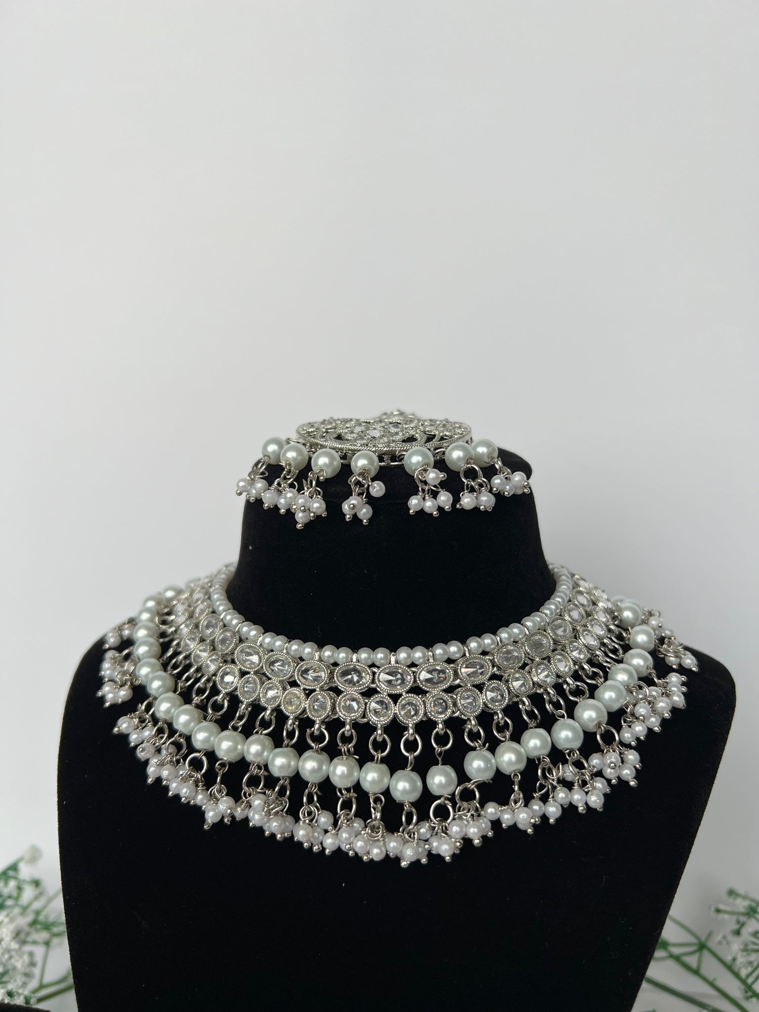 Heavy silver coloured necklace set with stunning jhumki earrings that are lightweight, comes with a beautiful tikka