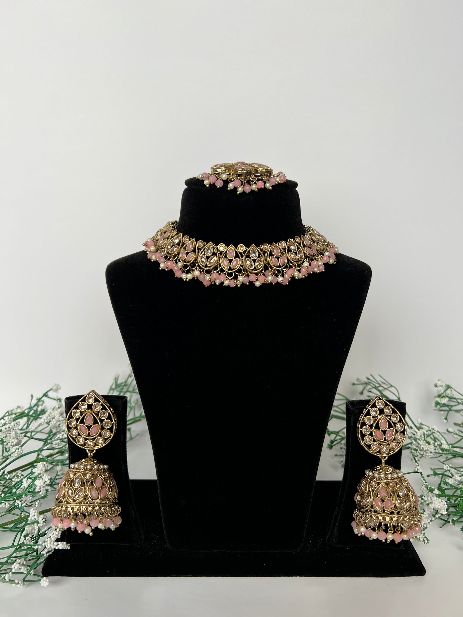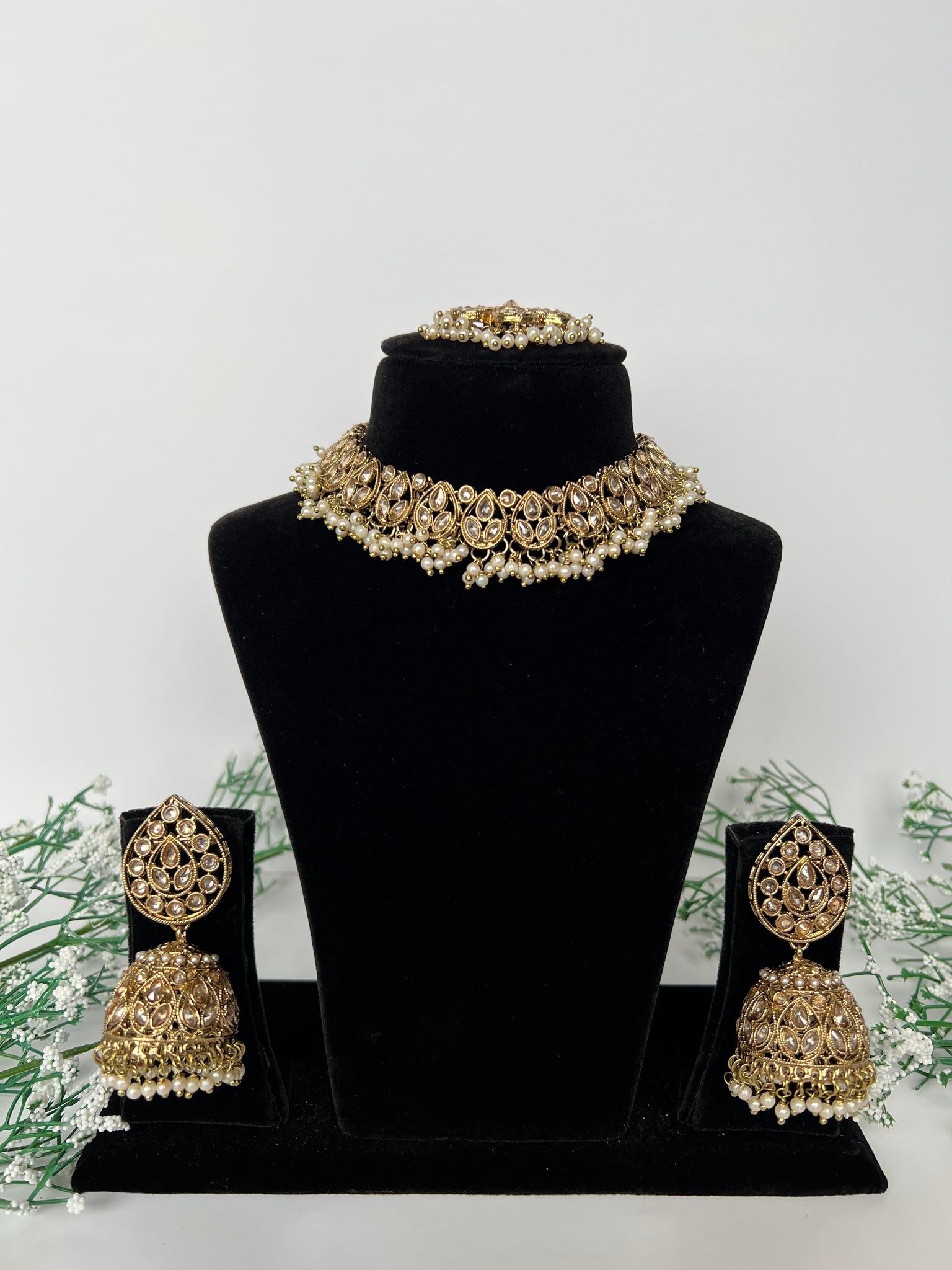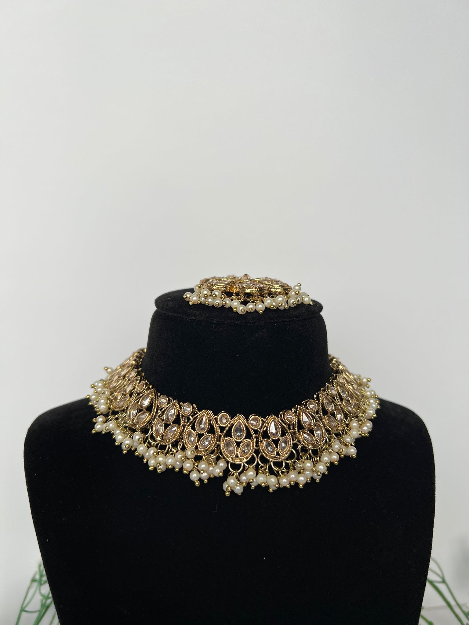 A Stunning necklace set with beautiful jhumki earrings that are lightweight, comes with a beautiful tikka