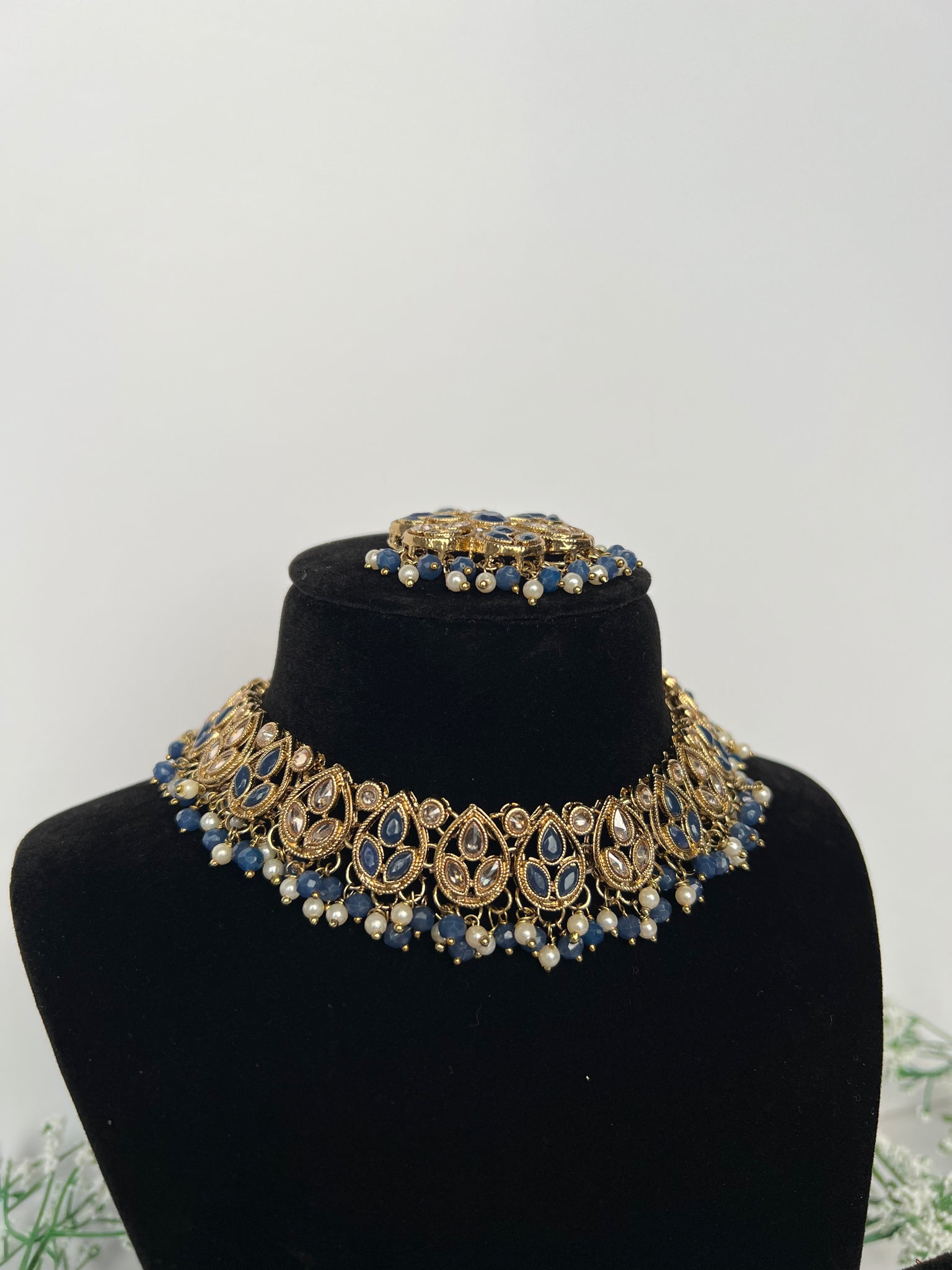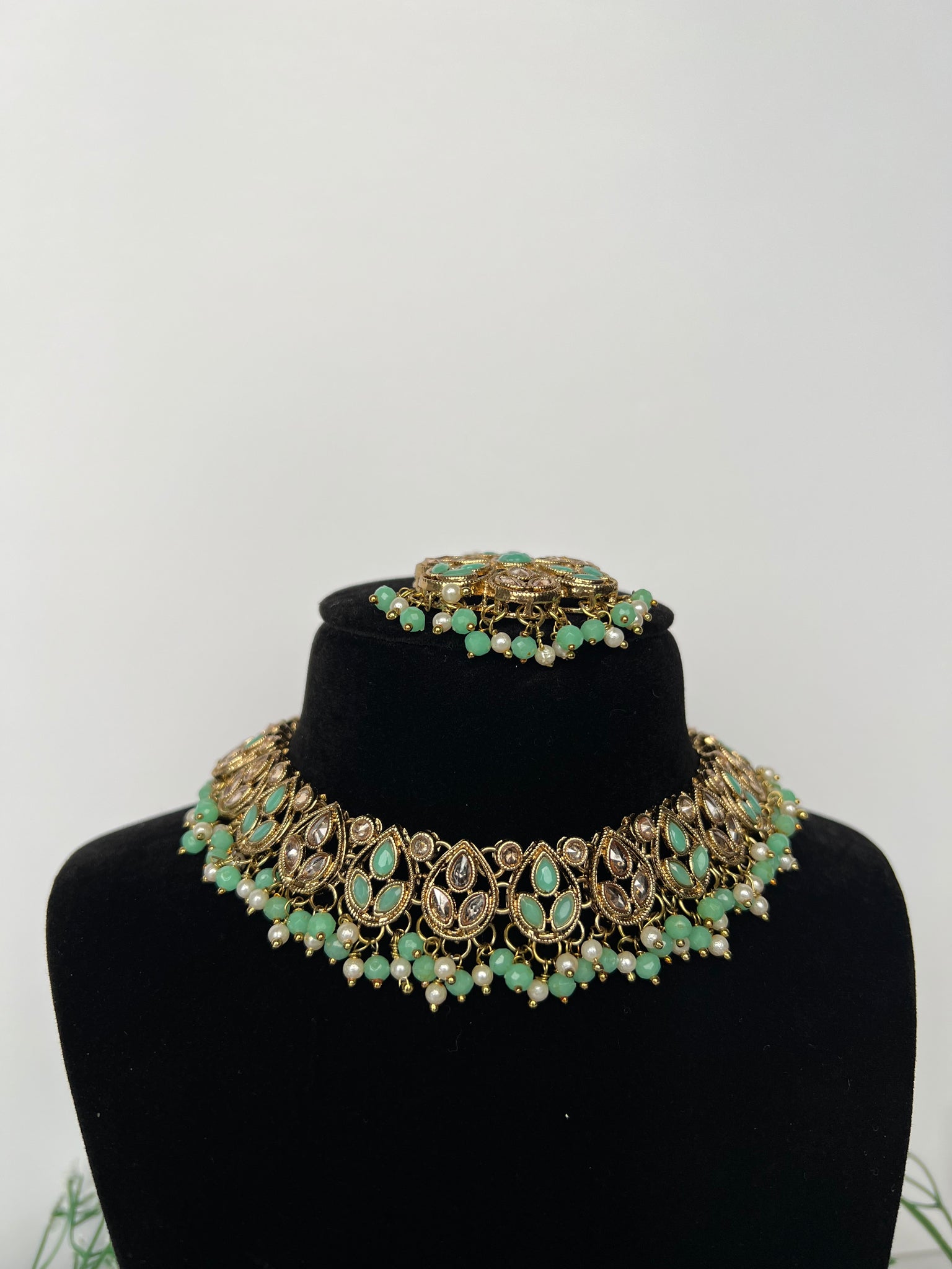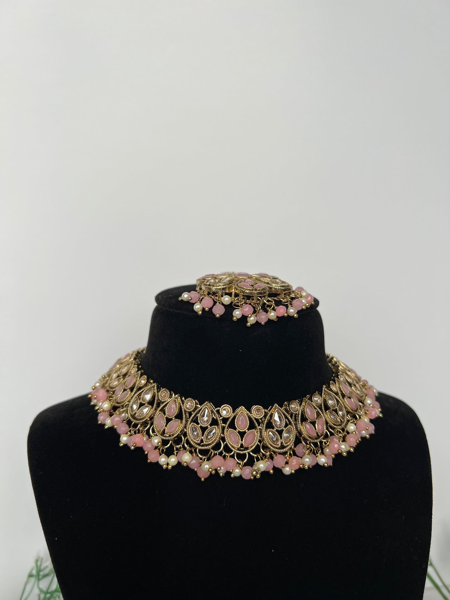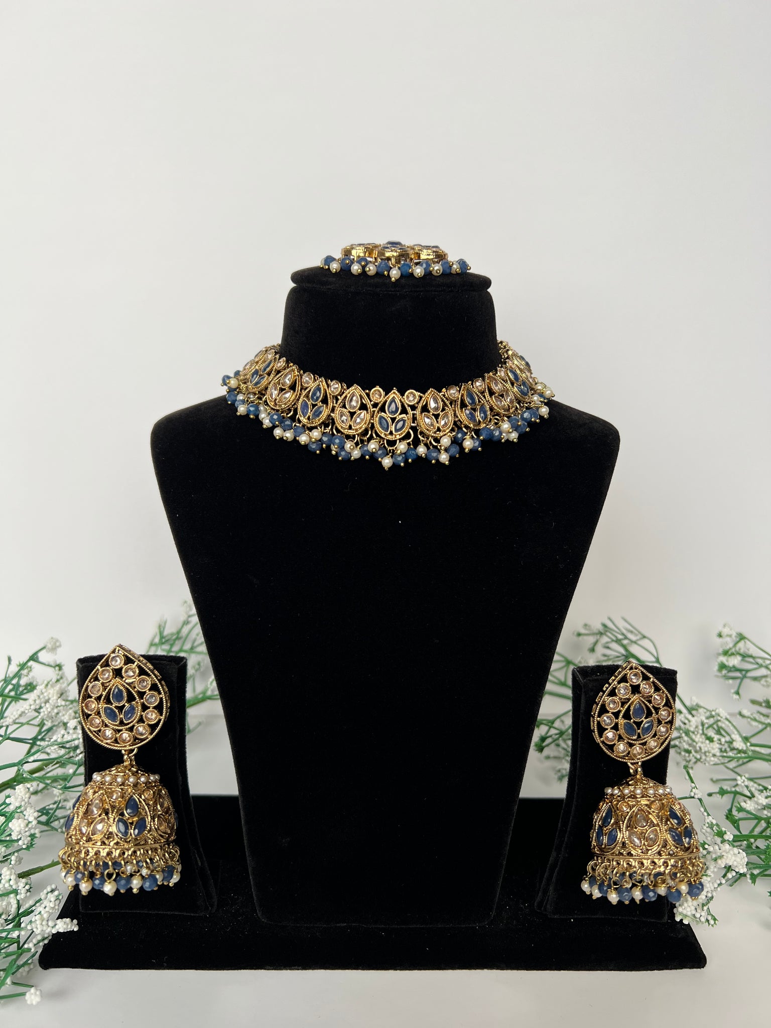 A Stunning necklace set with beautiful jhumki earrings that are lightweight, comes with a beautiful tikka