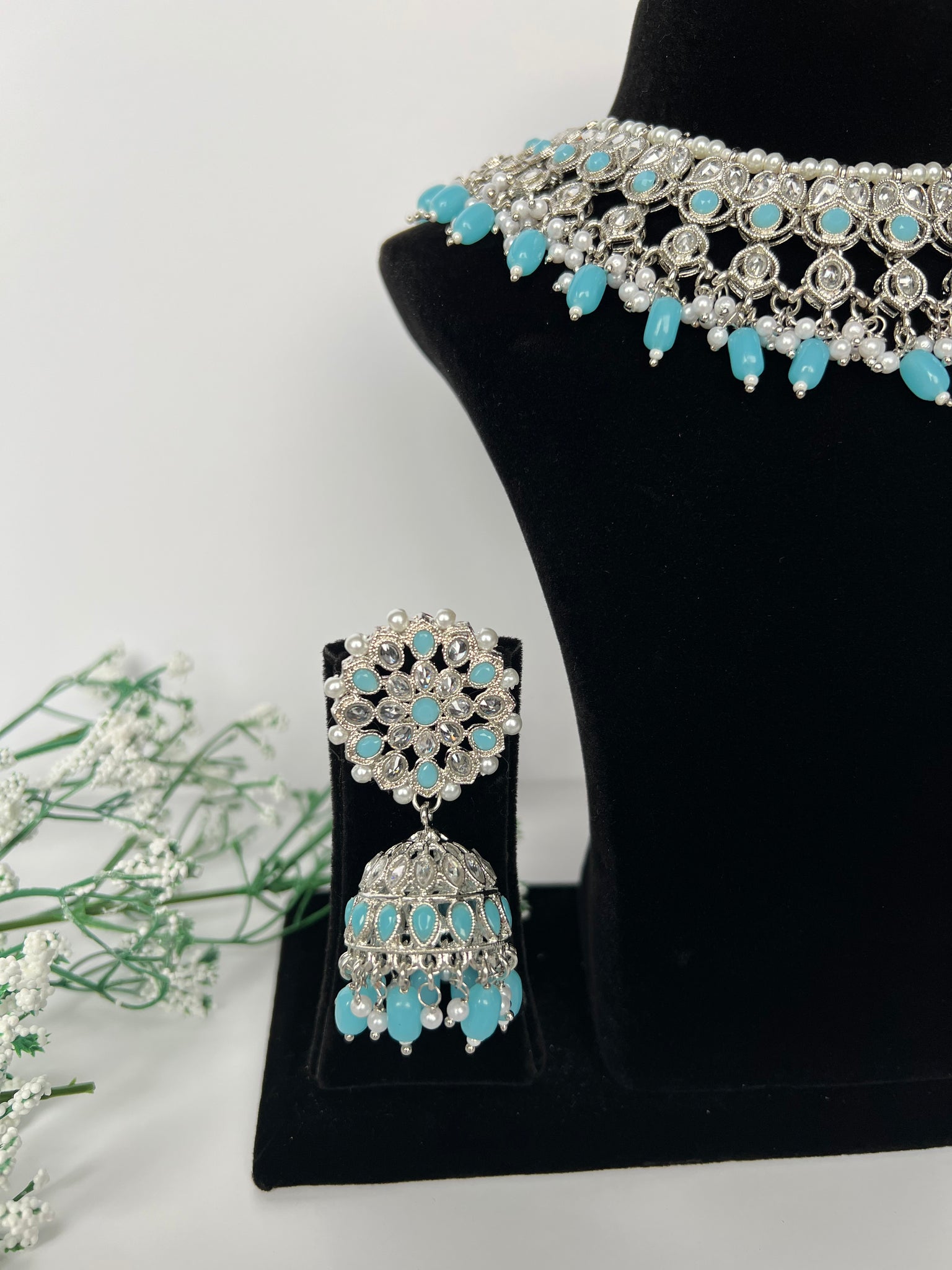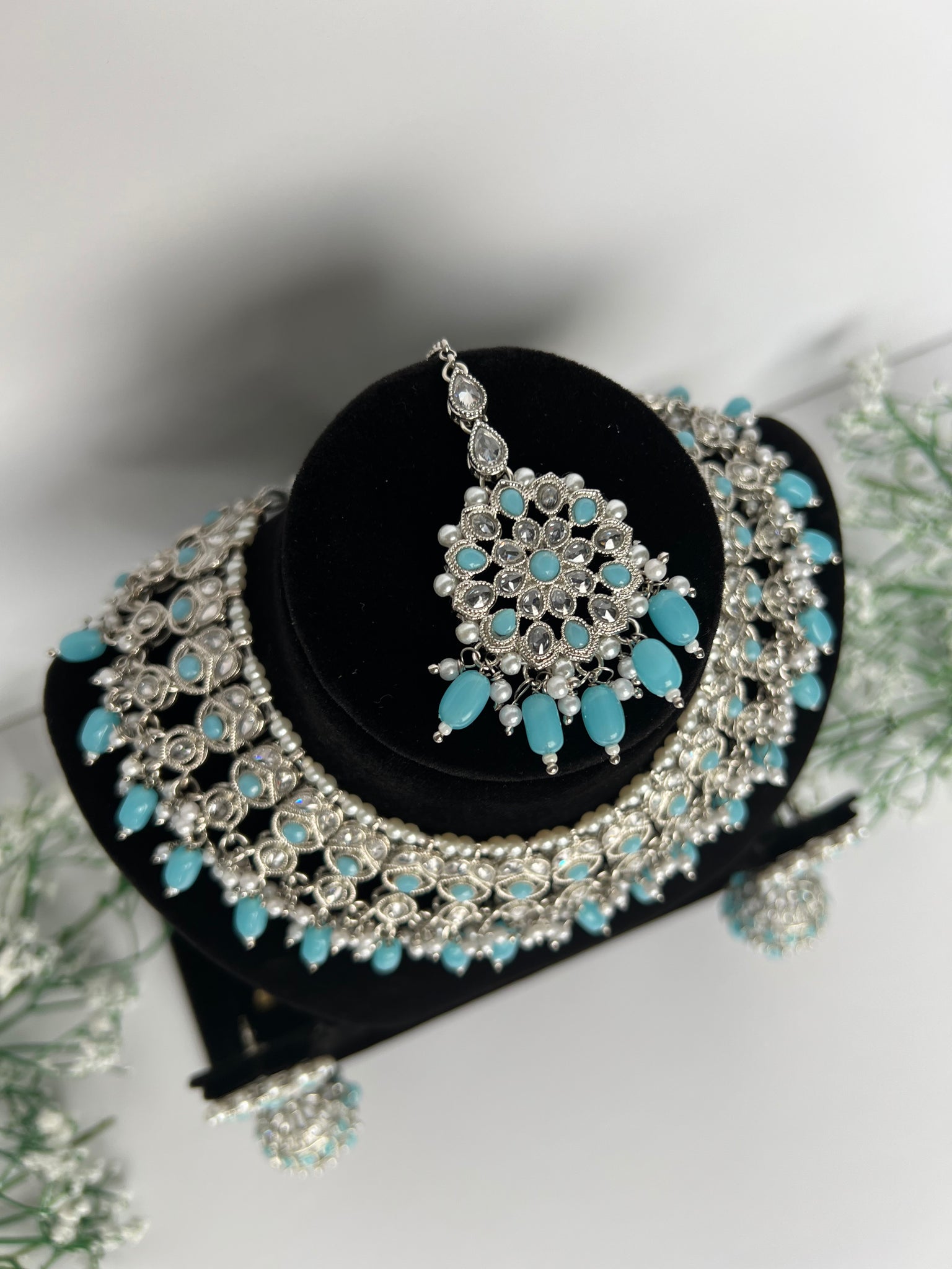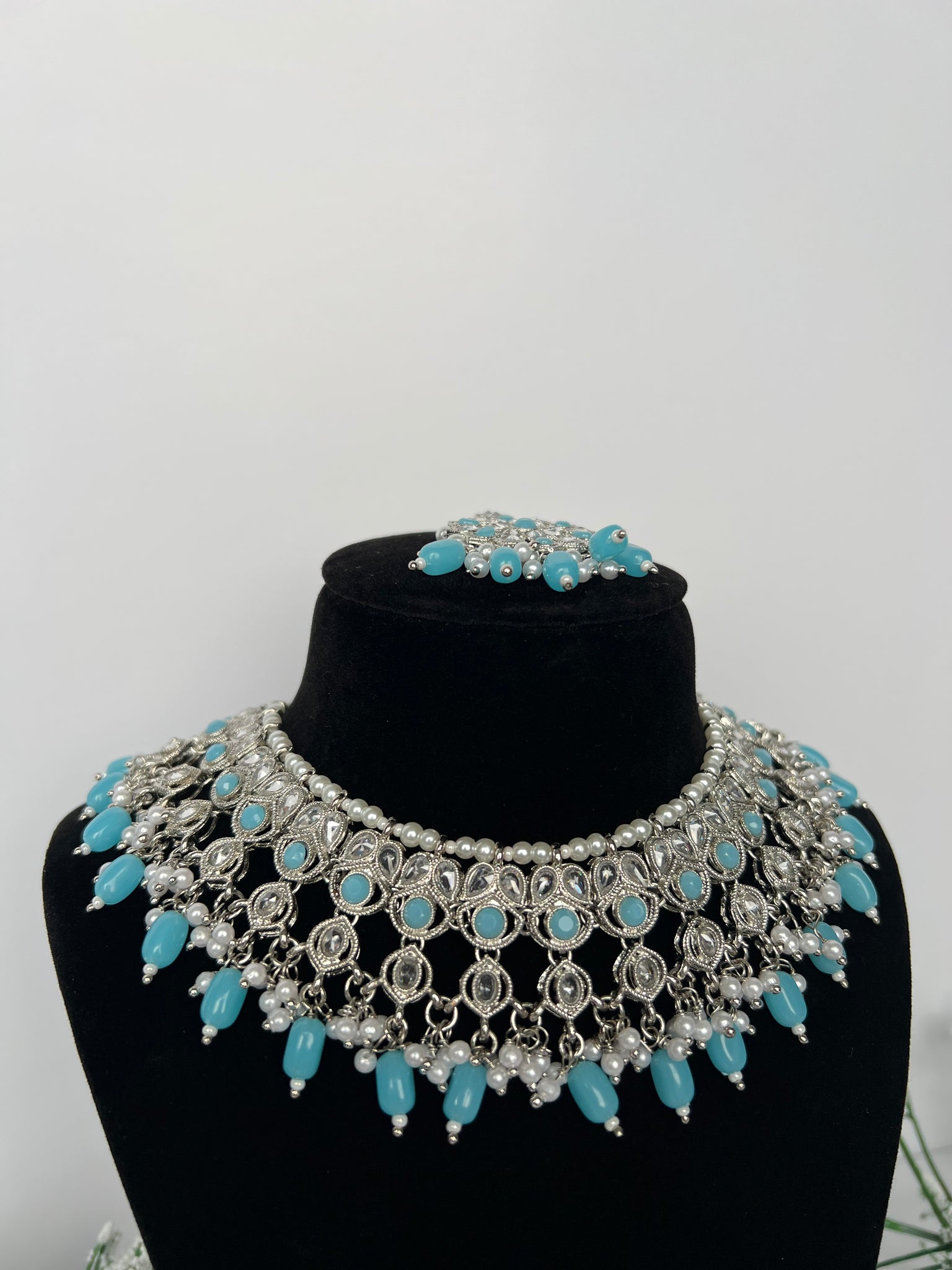 Baby blue necklace set with jhumki and tikka in a silver combination