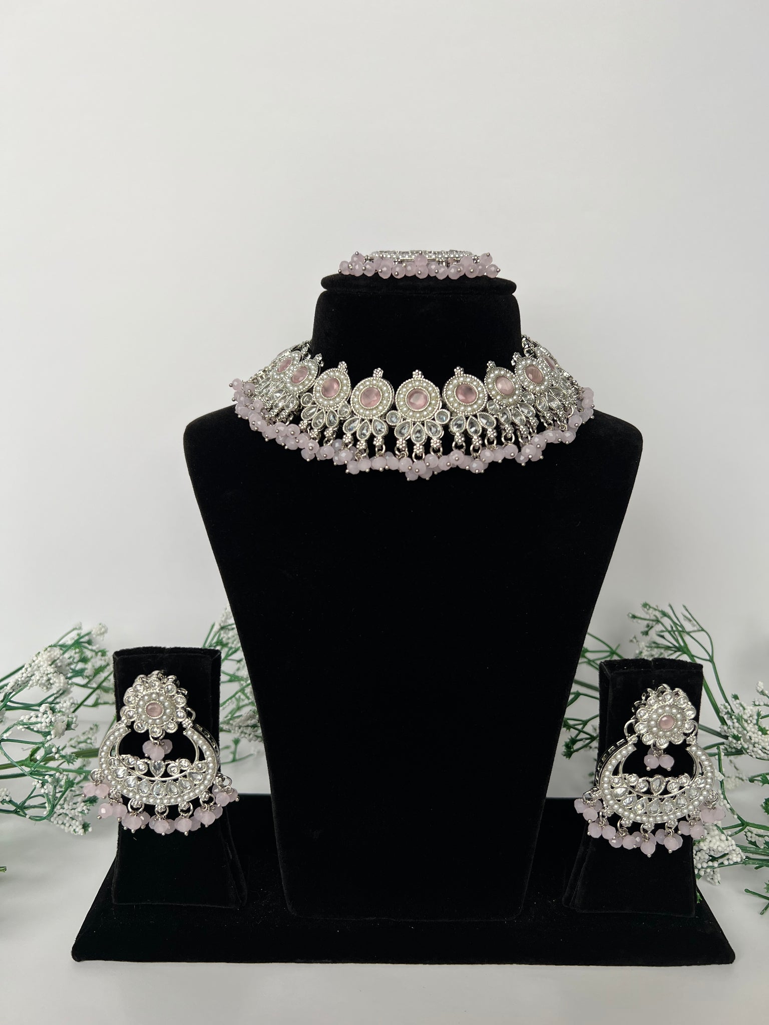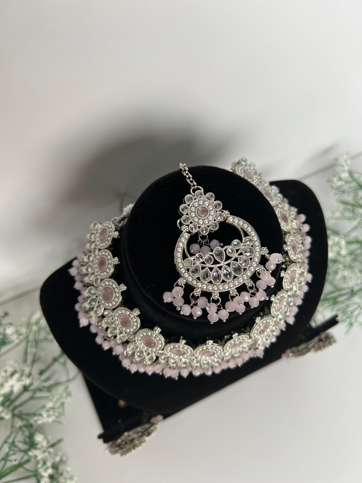 A stunning baby pink and silver necklace set with earrings & Tikka