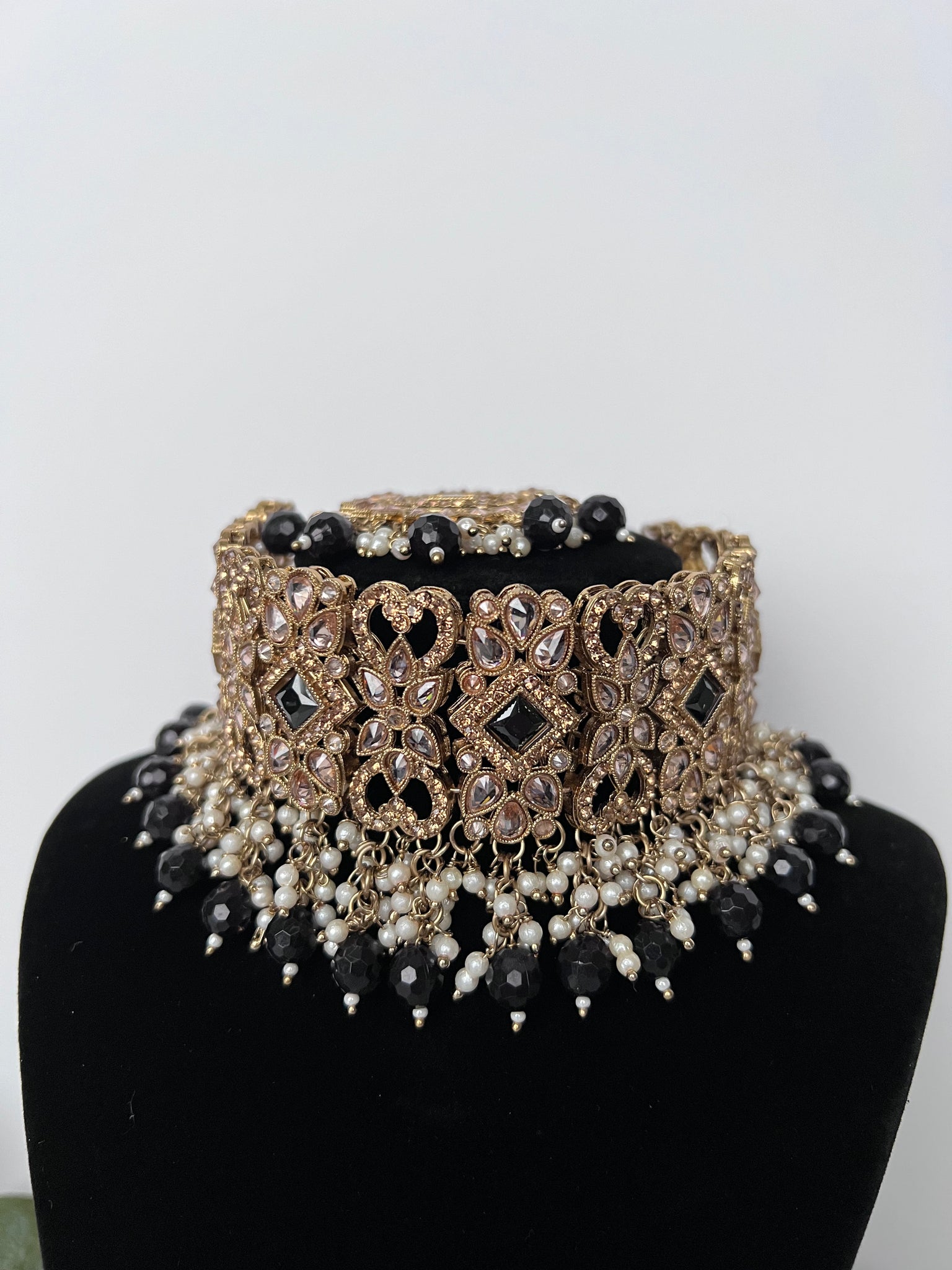 Beautiful black and gold choker set with lightweight earrings and tikka