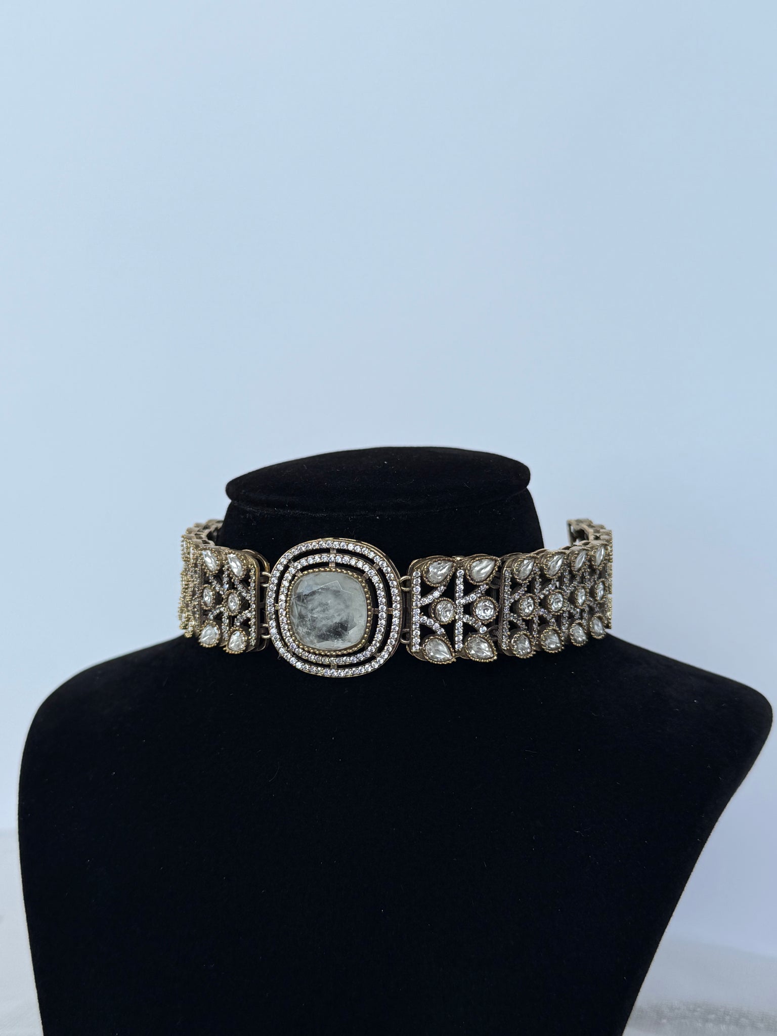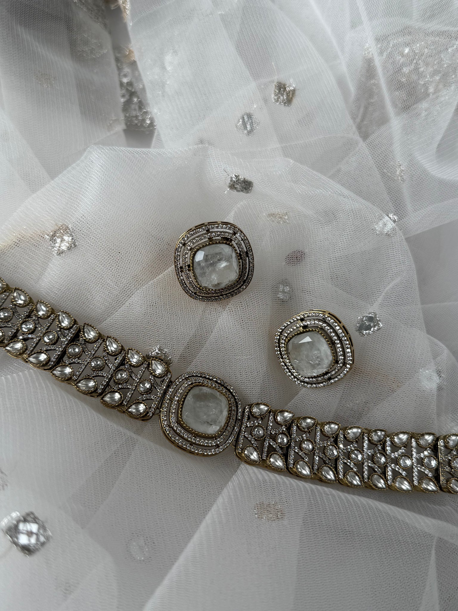 Gorgeous white marble finish kundan choker with intricate kundan work around the choker, comes with matching studs